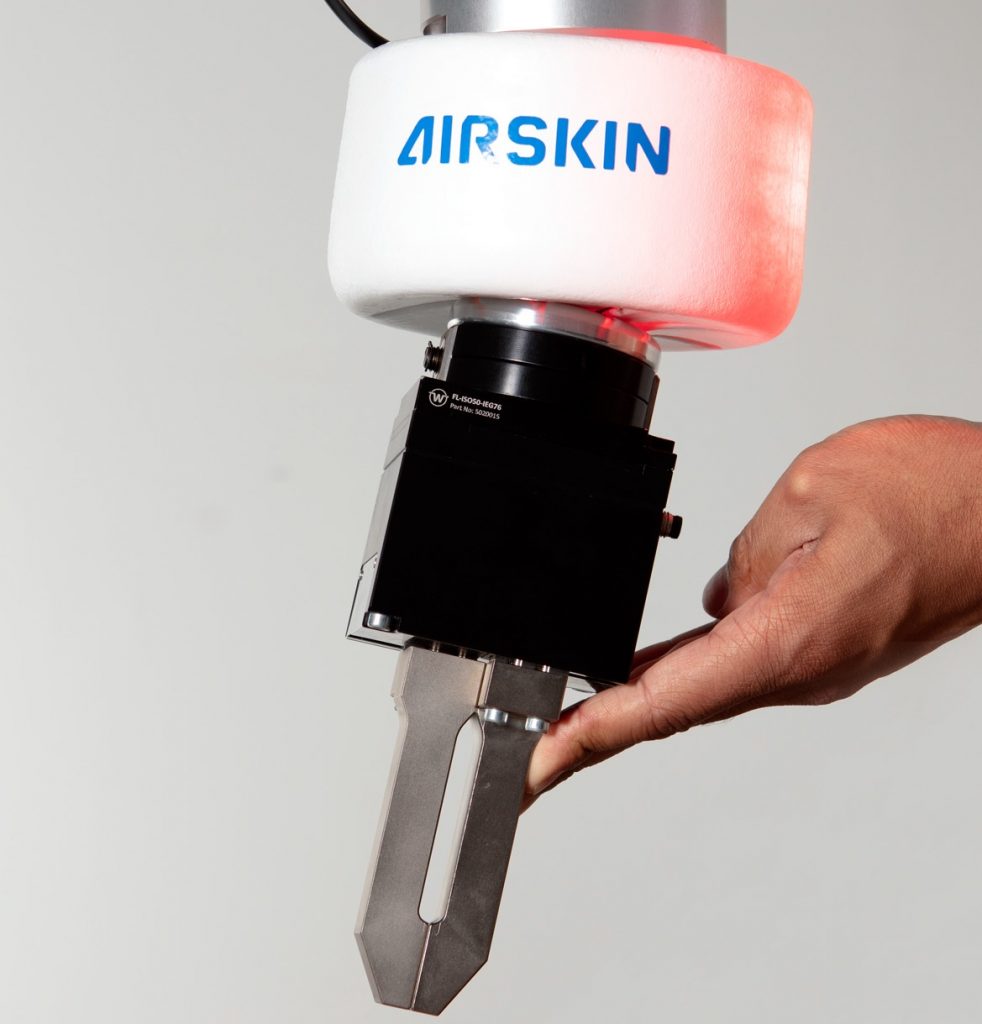 Bei dem Airskin Safetyflange handelt es sich um einen Kollisionssensor mit PLe/Cat3 ISO13849-Sicherheitszertifizierung, der durch einen speziellen ISO-Adapter mit zahlreichen Robotermodellen kompatibel ist. Der Sensor erkennt mögliche Kollisionen von Werkzeugen und Werkstücken in Winkel-, Axial- und Torsionsrichtung und sendet umgehend ein Stoppsignal an die Robotersteuerung. Diese reduziert daraufhin Druck und Kraft des Roboters. Nach vermiedener oder erfolgter Kollision arbeitet der Roboter automatisch weiter.