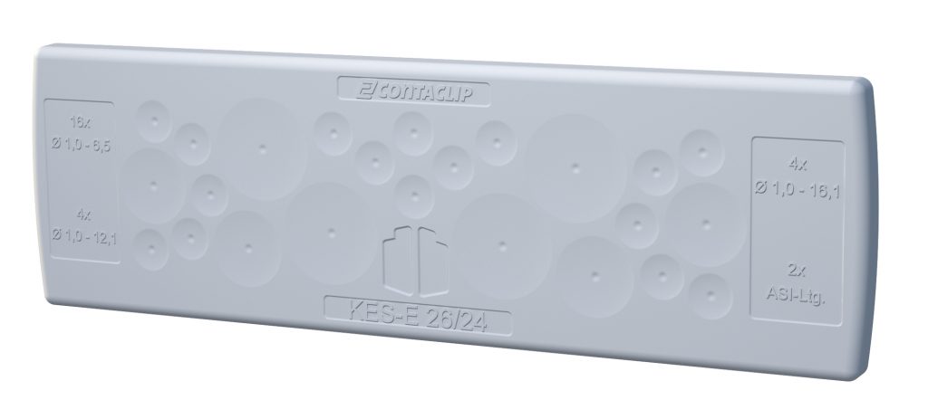 Conta-Clip baut sein KES-Programm um die schraubenlos montierbare Variante KES-E weiter aus. Die Kabeleinführungsplatten ermöglichen die schnelle und sichere Einführung nichtkonfektionierter Leitungen und Schläuche in Schaltschränke und Maschinengehäuse ohne aufwendige Kabelverschraubungen. Die Installation der neuen Kabeleinführungen erfolgt aufgrund der umlaufenden Profildichtung ohne Werkzeugeinsatz. Die Einführungen werden in die erforderlichen 36x112mm großen Standard-Durchlassöffnungen der Schrank- bzw. Gehäusewand gedrückt. Dabei wölbt sich die innere, elastische Dichtlippe der Profildichtung hinter die Innenseite des Gehäuses und sorgt so für einen sicheren und rüttelfesten Halt. Die Einführungsplatten eignen sich für Wandstärken von 1,5 bis 2,5mm. Zunächst sind neun Varianten für Kabel und Pneumatikschläuche mit Durchmessern von 1 bis 16mm verfügbar. Ausführungsabhängig ermöglichen sie die Einführung von bis zu 48 Leitern oder Schläuchen pro Platte und erreichen damit eine hohe Packungsdichte. Durch die Auslegung in IP64 schützt das Kabeleinführungssystem sicher gegen Staub und Spritzwasser.