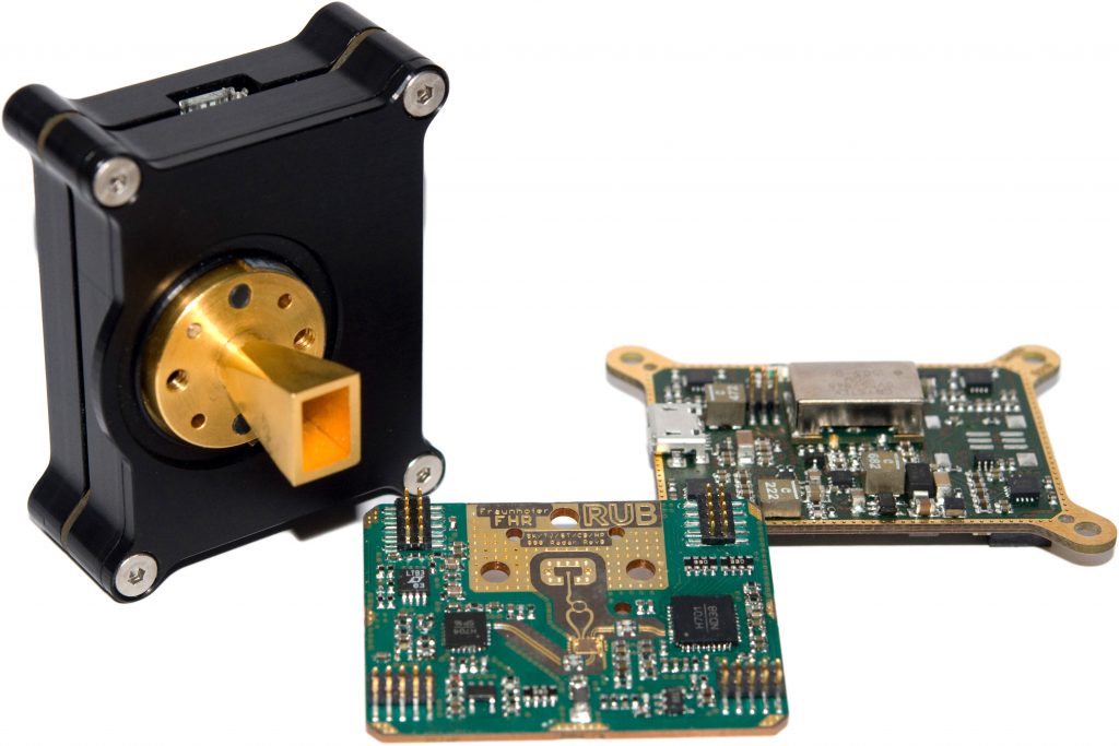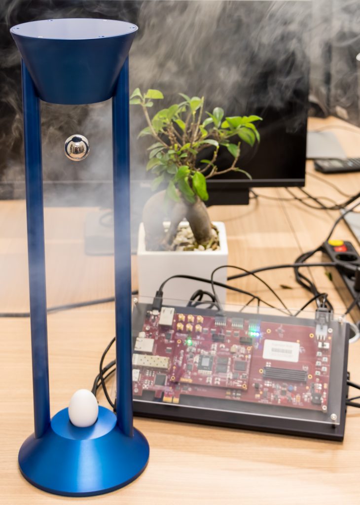In den Forschungslaboren konnte jüngst die Messgenauigkeit der Radartechnik auf Rekordwerte von besser 1µm gesteigert werden. Möglich wird dies durch die Erweiterung der genutzten Bandbreite, eine höhere Systemstabilität und zusätzlichen Optimierungen in der Signalauswertung. Die Standardabweichung beträgt dabei 140nm in einem Meter Entfernung bei 1kHz Messrate. Mit dieser Performance sind Radarsysteme künftig in vielen Applikationen eine ernstzunehmende Alternative zu optischen Distanzsensoren. Die Radartechnik ist deutlich unempfindlicher gegenüber Rauch, Nebel oder Staub, weil Millimeterwellen diese durchdringen können und nicht auf saubere Optiken angewiesen sind. Zudem ist dank des Einsatzes von modernen Chip-Produktionstechnologien Radarsensorik in den höheren Frequenzbereichen in großen Stückzahlen auch im Bereich der Low-Cost-Sensorik möglich. Die an der Ruhr-Universität Bochum und dem Fraunhofer FHR entwickelten FMCW-Radarsysteme werden bereits erfolgreich in mehreren Applikationen, wie z.B. Stahlwerken unter rauen Bedingungen eingesetzt und haben bisher ein positives Anwenderfeedback zur robusten und zugleich hochpräzisen Sensortechnologie hervorgerufen. Es existiert eine Auswahl an kleinen und leicht in Testapplikationen zu integrierenden USB-Sensoren. Die aktuellen Forschungssysteme liegen in Frequenzbereichen um 145 und 240GHz, wobei das 240GHz-System aufgrund der auf dem Sensorchip integrierten Antennen die Aufbautechnik deutlich vereinfacht und damit günstige Sensoren auch in großen Stückzahlen ermöglicht. Es laufen Forschungsarbeiten den Frequenzbereich weiter zu erhöhen, um eine einfachere Frequenzzulassung der Systeme zu ermöglichen. Dadurch wird die Abdeckung noch größerer Bandbreiten möglich, was wiederum eine noch bessere Messgenauigkeit erlaubt. Der Einfluss von Staub, Luftfeuchtigkeit oder Nebel wird bei höheren Frequenzen größer, ist aber immer noch deutlich geringer als bei optischen Sensorsystemen. In Bild 2 ist eine schwebende Kugel dargestellt, die durch einen Elektromagneten in Kombination mit einer Regelschleife in einer programmierbaren Höhe gehalten wird. „Die Position der Kugel wird mikrometergenau durch den Sensor im Fuß des Aufbaus bestimmt und die Position ungestört vom künstlich generierten Nebel geregelt“, berichtet Alexander Orth, Mitarbeiter der Ruhr-Universität Bochum. Der Regler und die echtzeitfähige Radarauswertung wurden auf Basis der Zynq Plattform von Xilinx realisiert.