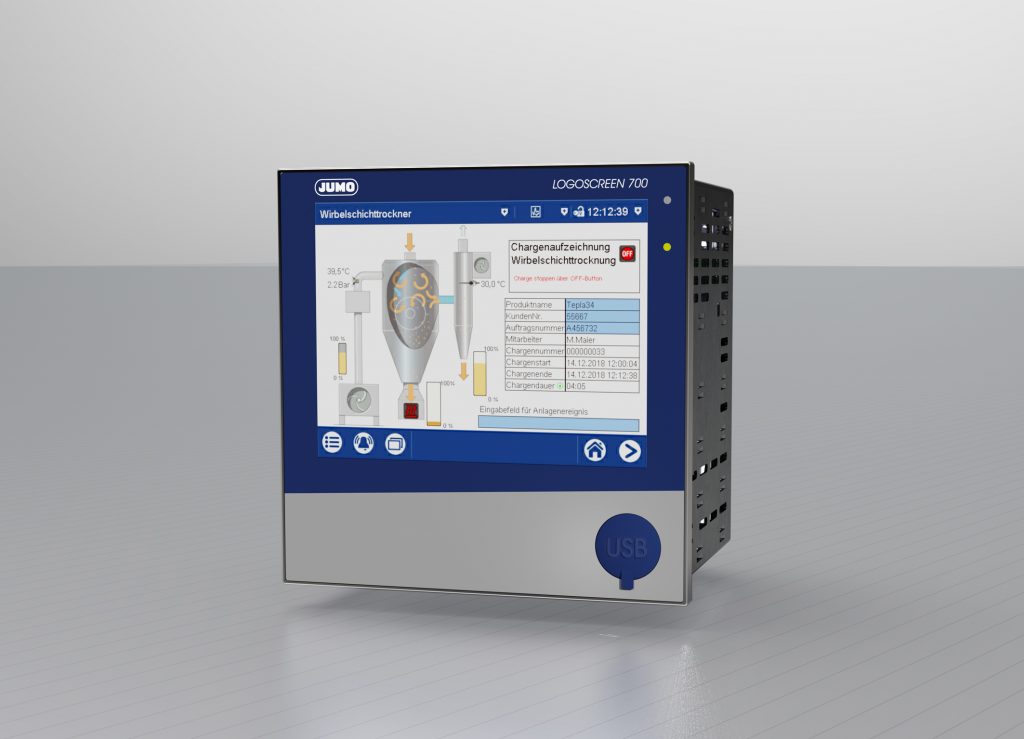 Der Logoscreen 700 ist das neueste Modell der Bildschirmschreiber-Serie von Jumo. Die Bandbreite der Ausstattungsmöglichkeiten reicht von einer Geräteausführung ohne Messeingang bis hin zu Ausführungen mit maximal 18 Messeingängen, drei Analogausgängen, 18 Digitaleingängen, 24 einzeln umschaltbare Digitalein- oder -ausgängen und sieben Relaisausgängen. Dank einer Tiefe von 119mm spart der Anwender Platz beim Einbau. Die Inbetriebnahme erfolgt mithilfe von Push-In-Klemmen. Der 5,7″-TFT-Farbgrafikbildschirm verfügt über einen Touchscreen. Durch das Icon-basierende System reichen meist maximal drei Touch-Bewegungen, um die gewünschten Prozessdaten anzuzeigen. Über Profinet können bis zu 60 Kanäle analog und digital aufgezeichnet und 120 externe Analog- und Digitaleingänge angezeigt werden. Bis zu acht Zähleingänge ermöglichen eine Durchflussmessung auf Basis von schnellen digitalen Impulsgebern. Durch eine Manipulationserkennung mit neuesten Hash-Algorithmen mit digitalem Zertifikat wird höchste Sicherheit bei der Datenerfassung sichergestellt. Eine rückseitig plombierbare Klemmabdeckung für die Anschlüsse bietet zudem Schutz vor unbefugtem Zugriff auf die Sensorklemmen. Eine Anlagenvisualisierung oder die Darstellung von Prozesszuständen ist mit bis zu zehn kundenspezifischen Prozessbildern möglich. Mittels Strukturierten Texts (ST-Code) werden eigene Applikationen flexibel realisiert. Die Prozesswerte können mittels einer App auf Smartphones und Tablets dargestellt werden. Daten werden in einem variablen Speicherzyklus ab 125ms erfasst und auf dem internen 1GB Speicher gesichert. Für den Dokumentationsnachweis qualitätsbezogener Daten stehen bis zu fünf anpassbare Chargenprotokolle mit automatischem Chargenausdruck zur Verfügung.