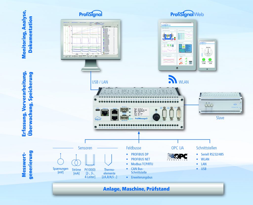 Die Konfiguration der ProfiMessage D-Geräte erfolgt mit der Software Konfigurator. Zudem bietet die ProfiSignal-Software viele Feldbusschnittstellen. Im Master-Gerät stehen eine Profinet, zwei Profibus DP Slave-Schnittstellen, eine Modbus TCP und eine Modbus RTU, sowie eine frei konfigurierbare CAN-Schnittstelle bereit. Die Schnittstellen lassen sich alternativ auch zur Verbindung mit beliebigen seriellen Messgeräten über RS232/485 verwenden. Die Software ist gleichermaßen für kleine als auch große Kanalzahlen ausgelegt. Vielfältige Alarmierungs- und Überwachungsfunktionen stehen dem Anwender zur Verfügung. Selbst große Datenmengen lassen sich bequem verarbeiten. Drei skalierbare Software-Pakete sichern die ideale Erfassung aller Messwerte. Mit dem neuen Add-on ProfiSignal Web ist zudem die standortunabhängige Visualisierung und Analyse der Messdaten auf beliebigen Endgeräten möglich. Die Installation einer Client-Software ist nicht erforderlich, da ausschließlich ein Standard-Browser benötigt wird. Der Server von ProfiSignal Web kann wahlweise auf einem PC/Server oder direkt im ProfiMessage D-Mastergerät installiert werden. Überwachungs- und Automatisierungsaufgaben werden im ProfiMessage D-Gerät über Softwarekanäle realisiert, d.h. vordefinierte Funktionsmodule die vom Benutzer individuell per Mausklick angelegt, konfiguriert und geräteintern abgearbeitet werden. So können z.B.mittels Rechenkanälen Messwerte online miteinander verrechnet werden. Grenzwertkanäle überwachen Messwerte und schalten im Alarmfall Alarme oder versenden E-Mails. Die Anzahl der verfügbaren Softwarekanäle ist nicht limitiert. Alle Funktionen werden autonom durch den Prozessor durchgeführt.