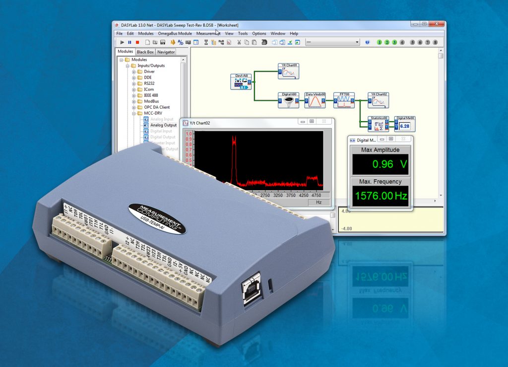 Mit der Software DasyLab können Anwendungen in der Messdatenerfassung und -analyse schnell und einfach ohne textbasierte Programmierung erstellt werden. Nahezu alle Messgeräte von Measurement Computing und Data Translation mit USB-, Ethernet- und PCI/PCIe-Schnittstelle können ohne zusätzliche Treiberinstallation eingebunden werden. Die ganze Bandbreite der Funktionen dieser Messmodule wird von der Software unterstützt. Analoge Ein- & Ausgänge, digitale I/Os sowie Zählerfunktionen ermöglichen die volle Leistungsfähigkeit für flexible Anwendungen. Neben zahlreichen Werkzeugen zur Visualisierung und für Analysen ist die Software mit Modulen zur Ablaufsteuerung auch für Steuerungs- und Regelungsaufgaben geeignet. Mit dem aktuellen Update sind jetzt auch die Treiber der neuen USB-1808-Serie integriert. Diese bieten die simultane Erfassung der analogen Eingänge bei 18Bit Auflösung sowie der digitalen Eingänge und Inkrementalgebereingänge bis zu 200kS/s pro Kanal. Auch die synchrone Ausgabe von analogen und digitalen Signalen bis 500kS/s pro Kanal wird unterstützt.