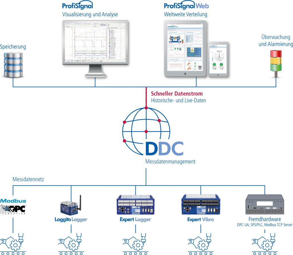 Für die Datenvisualisierung und -analyse steht das Softwarepaket ProfiSignal zur Verfügung, das mit dem browserbasierten Addon ProfiSignal Web um die Möglichkeit des weltweiten mobilen Zugriffs erweitert werden kann. Darüber hinaus kann eine permanente Datenspeicherung z.B. auf einem NAS-Laufwerk initiiert werden. Der Turbinenhersteller nutzt das System sowohl zur Online-Überwachung aktiver Prüfstandsläufe, als auch zur Analyse aufgezeichneter Messdaten. Besonders wichtig ist die Möglichkeit des unterbrechungsfreien Umschaltens zwischen historischen und Live-Daten. Ein besonders hohes Maß an Datensicherheit wird erreicht, wenn Datenlogger und Messdatenerfassungen im Feld eingesetzt werden. Der integrierte Scheduler ermöglicht ein automatisiertes und intelligentes Auslesen sowie zentralisiertes Archivieren aller Messdaten. Auch bei Störungen oder Unterbrechungen im Netzwerk ist somit eine lückenlose Datenerfassung und Datenkonsistenz gewährleistet. Beim Turbinenprüfstand dürfen keinesfalls Daten verloren gehen. Dies wird sichergestellt, indem die Messdaten sowohl in den Erfassungsgeräten, als auch auf erfassungsnahen Messrechnern redundant zwischengespeichert werden. Auch die zentrale Speicherung und Verwaltung der Messdaten erfolgt redundant auf zwei hardwaremäßig getrennten Spiegelservern.