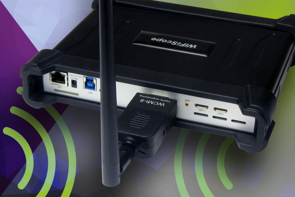 Das Wireless Multi Instrument Synchronization Module WCMI von Plug-In kann mehrere Oszilloskope drahtlos über eine Entfernung von bis zu 400m synchronisieren und zu einem einzigen Instrument kombinieren. Das WCMI-Modul lässt sich an den WiFi-Scopes und Handy-Scopes der Serie 5 und 6 betreiben und wird direkt am Erweiterungsanschluss auf der Rückseite angeschlossen. Die Multikanalsoftware erkennt automatisch, die Anzahl der Oszilloskope, welche sich im Empfangsbereich befinden und kombiniert diese zu einem einzigen Scope.