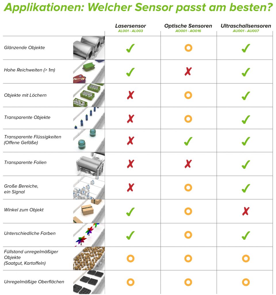 Für jede Aufgabenstellung lässt sich ein passendes Funktionsprinzip finden. Neben kapazitiven Füllstandsmessern mit begrenztem Einsatzbereich und günstigen induktiven Geräten sind in erster Linie Sensoren relevant, die mit optischen Signalen oder Schall arbeiten. Hier hat sich in jüngster Zeit am meisten getan und die technologische Entwicklung ist besonders rasant vorangeschritten. Lasersensoren kommen überall dort zur Anwendung, wo kleine Objekte erfasst werden sollen oder eine besonders präzise Positionserfassung erforderlich ist. Auch Reichweiten von weit über 50m sind damit problemlos zu realisieren. Laser benötigen dafür eine eindeutige Oberfläche, die den Lichtstrahl reflektiert. Für die Detektion von transparenten Materialien oder solchen mit gelochter Oberfläche sind sie allerdings nur bedingt, wenn überhaupt, geeignet. Optoelektronische Sensoren wie Lichtschranken oder Reflexionslichttaster sind wenig anspruchsvoll was die Beschaffenheit der Objekte angeht und liefern durch die Bank gute Ergebnisse, die für die meisten Anwendungen ausreichen. Deutlich sensibler sind sie, was ihre Umgebung angeht. Transparente Materialien, Rauch oder andere negative Einflüsse auf die optische Erfassung bekommen ihnen weniger gut und können die Ergebnisse verfälschen. Ultraschallsensoren dagegen bieten eine hohe Präzision und arbeiten zuverlässig über einen breiten Anwendungsbereich hinweg. Sie arbeiten mit akustischen Signalen, die auch durch Nebel, Staub oder Rauch praktisch nicht beeinflusst werden. Die Schallschwingungen erfassen auch über lange Strecken von mehreren Metern millimetergenau Positionen oder Füllstände. Metall, Glas, Holz oder Kunststoff – nahezu jedes Material lässt sich über Ultraschallsensoren erfassen, unabhängig von seiner Oberfläche, Farbe oder Transparenz. Bauartbedingt sind die Geräte selbstreinigend und damit selbst in schwierigsten Umgebungen praktisch wartungs- und störungsfrei zu betreiben. Lediglich bei angewinkelten Objekten, etwa in der Fördertechnik, stoßen sie an ihre Grenzen.