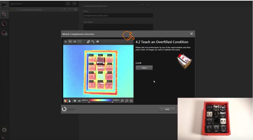 Wie einfach eine Applikationserstellung ist, zeigt das Beispiel einer Vollständigkeitsprüfung. Ein Produktionsbehälter wird mit mehreren Einzelprodukten befüllt. Mithilfe des Wizards wird eine Applikation zur Vollständigkeitsüberprüfung erstellt. Der Sensor erfasst den befüllten Behälter und die darin befindlichen Produkte werden als ROIs ausgewählt. Dies geschieht mithilfe einer Maske, die der Nutzer verschieben, vergrößern und anderweitig anpassen kann. Der Anwender bringt dem Sensor mit einem einzigen Mausklick bei, dass die getroffene Auswahl dem Idealzustand entspricht. Anschließend wird dem Sensor die Unterfüllung demonstriert, indem ein Produkt aus dem Behälter entfernt wird. Es ist nicht notwendig, die Unterfüllung für jeden ROI einzeln zu demonstrieren. Ein quer über den Behälter gelegter Gegenstand zeigt den Zustand der Überfüllung. Detektiert der Sensor nun einen der beiden nicht-gewünschten Zustände, leitet er ein Fehlersignal weiter. Durch den User defined mode wird noch eine weitere Funktion hinzugefügt. Zusätzlich zur Vollständigkeit soll überprüft werden, ob die Produkte auch in die richtige Kiste gefüllt wurden, da eine Kiste mit zu niedrigem Rand Probleme beim Stapeln verursachen kann. In dem Mode wird nun ein ROI auf den Rand der Kiste gelegt. Der Sensor misst den Abstand dorthin und schaltet, wenn dieser zu hoch oder zu niedrig ist.