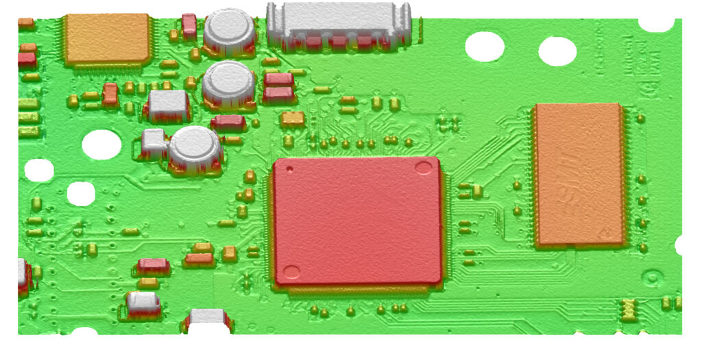 Der 3D-Sensor SC3xx0-240 kann in verschiedenen Anwendungen die Ebenheit von Oberflächen überprüfen. Durch die hohe Auflösung ist der Sensor auch für Bauteile geeignet, bei der an die Oberfläche hohe Anforderungen in Bezug auf die Ebenheit gestellt werden. Ein Beispiel hierfür sind Bipolarplatten, die in Brennstoffzellen benötigt werden. Dichtflächen von Ventilen, Bremsbeläge oder Smartphone-Gehäusen, in denen Defekte erkannt werden müssen, sind weitere Anwendungsbereiche. Auch in der Elektronikfertigung spielt die Oberflächeninspektion eine wichtige Rolle. So werden Leiterplatten in vielen Fällen einer Qualitätskontrolle unterzogen, um sicherzustellen, dass die Qualität der Leiterbahnen, Lötstellen oder Oberflächenbeschichtungen den Vorgaben entspricht. Auch Fehler, wie Kurzschlüsse, Unterbrechungen oder fehlerhafte Lötverbindungen können erkannt werden. Für solche Aufgaben sind die SurfaceControl-Sensoren ebenfalls geeignet. Gerade bei der Überprüfung sehr kleiner Strukturen auf bestückten Elektronik-Baugruppen kommt der SC35x0-30 zum Einsatz. Mit ihm lassen sich beispielsweise die richtige Platzierung von kleinsten SMD-Bauteilen auf der Leiterplatte kontrollieren. Hierbei ist neben der Höhenmessung in z-Richtung auch die horizontale Genauigkeit der Messung entscheidend.