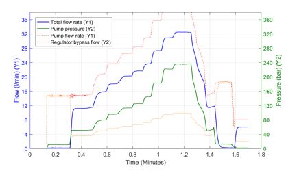 Welche Gesteine lassen sich wie zerstören, und mit welchem Energieaufwand? So lautet auf den Punkt gebracht die Frage, der das Forscherteam im Dienste der Wissenschaft nachgeht. Für jede Gesteinsart muss ein individuelles Verfahren gefunden und festgelegt werden, um bei den aufwendigen Tiefenbohrungen unliebsame Überraschungen und Verzögerungen zu vermeiden. Dazu wurden aus ganz Europa Gesteinsproben gesammelt, die nun unter reproduzierbaren Bedingungen mit einem Hochdruck-Wasserstrahl beschossen werden. Dreh- und Angelpunkt des Versuchsaufbaus ist die Erfassung des tatsächlich benötigten Volumenstroms beim Wasserschneiden. Bei den gängigen Verfahren und Maschinen ist dieser Wert in einer Blackbox verborgen. Das liegt auch daran, dass die Messung des Volumenstroms aufgrund des hohen Drucks extrem aufwendig wäre. Am GZB wählte man ein anderes Verfahren, das aus technischer Sicht bestechend einfach ist, aber zuverlässig hoch präzise Ergebnisse liefert. „Prinzipbedingt besteht bei einer Kolbenpumpe eine eindeutige Korrelation zwischen der Drehzahl des Motors und dem Volumenstrom“, erläutert Viktor Hartung, im Team verantwortlich für die Mess- und Regeltechnik. Je präziser demnach die Erfassung der Drehzahl, desto genauer auch der Wert des Volumenstroms. Ein Dieselmotor lässt sich allerdings auch nur in einem bestimmten Drehzahlbereich betreiben. Für die Messung der Motorendrehzahl setzt Hartung einen induktiven Sensor und die entsprechende Verkabelung ein. Über ein Druckregelventil hinter der Kolbenpumpe ist es zusätzlich möglich, einen Maximaldruck bis zu 320bar einzustellen. Befindet sich der Druck unterhalb des eingestellten Regelwertes, kann der Volumenstrom direkt aus der Motordrehzahl bestimmt werden. Greift dieses Ventil ein, wird ein Teil des Volumenstroms zurück in den Tank geführt, um den Druck zu reduzieren. Bei besonders kleinen Düsen ist das bereits bei der Leerlaufdrehzahl des Dieselaggregates der Fall. Um die tatsächlich benötigte Wassermenge exakt erfassen zu können, muss die abgezweigte Menge gemessen werden, damit sie von der Gesamtmenge abgezogen werden kann. Dies geschieht über einen zweiten, magnetisch-induktiven Sensor, welcher sich hinter dem Regelventil an der Rückführung zum Tank befindet. Bei abgeschaltetem Verbraucher und Leerlauf des Dieselmotors wird die gesamte Wassermenge durch diesen Sensor geführt und stimmt mit der Menge, die durch die Drehzahl bestimmt wird, überein. So lassen sich kontrollierte Versuche an den verschiedenen Gesteinsproben durchführen, die Rückschlüsse auf die idealen Parameter bei der Bohrung zulassen.