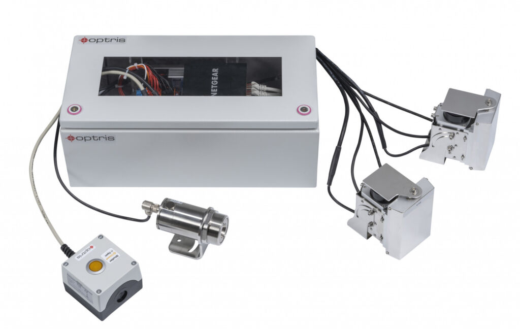 Der geringe Emissionsgrad von Low-E-Glas für Fenster und Fassadenelemente ist eine Herausforderung für IR-Messgeräte, die traditionell die Glastemperatur von oben messen, wenn die Scheiben im Zuge des Glashärtungsprozesses aus dem Ofen herausbewegt werden. Das Bottom up Glasinspektionssystem von Optris löst dieses Problem durch die Installation von zwei IR-Kameras unterhalb der Vorspannlinie. Diese messen die Temperatur immer auf der nicht beschichteten Seite des Glases mit hohem Emissionsvermögen (1.600 Pixeln Scanzeilenauflösung und max. Sichtfeld von 111°/4,3m Scanbreite). Beide Kameras werden durch ein optris CTlaser 4M Pyrometer in Kombination mit dem digital gesteuerten Optikschutzsystem zuverlässig bei Glasbruch geschützt.