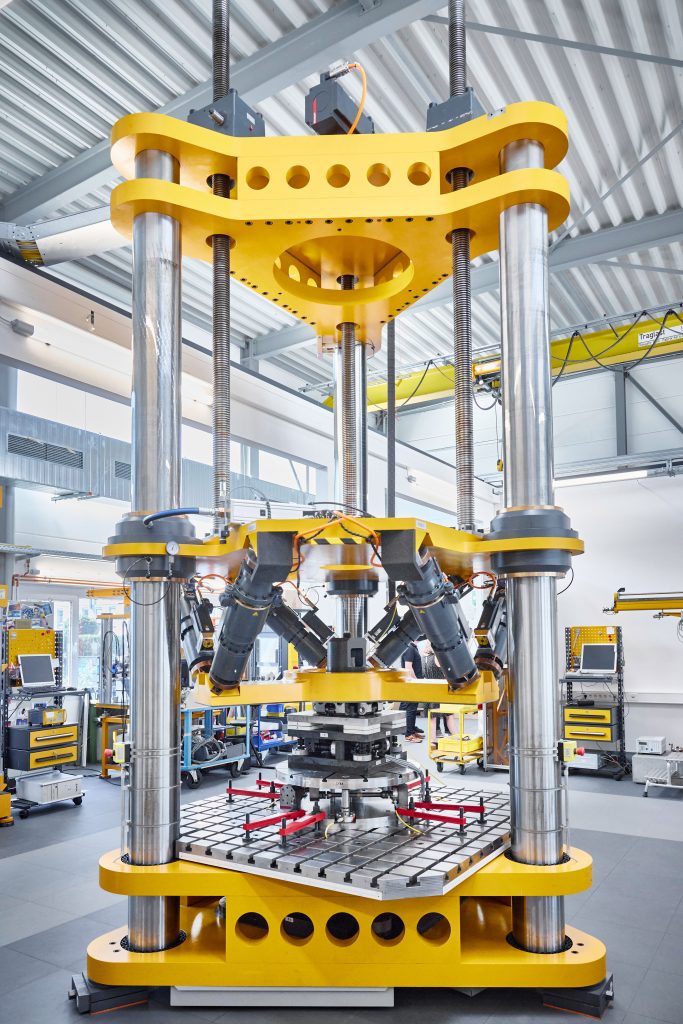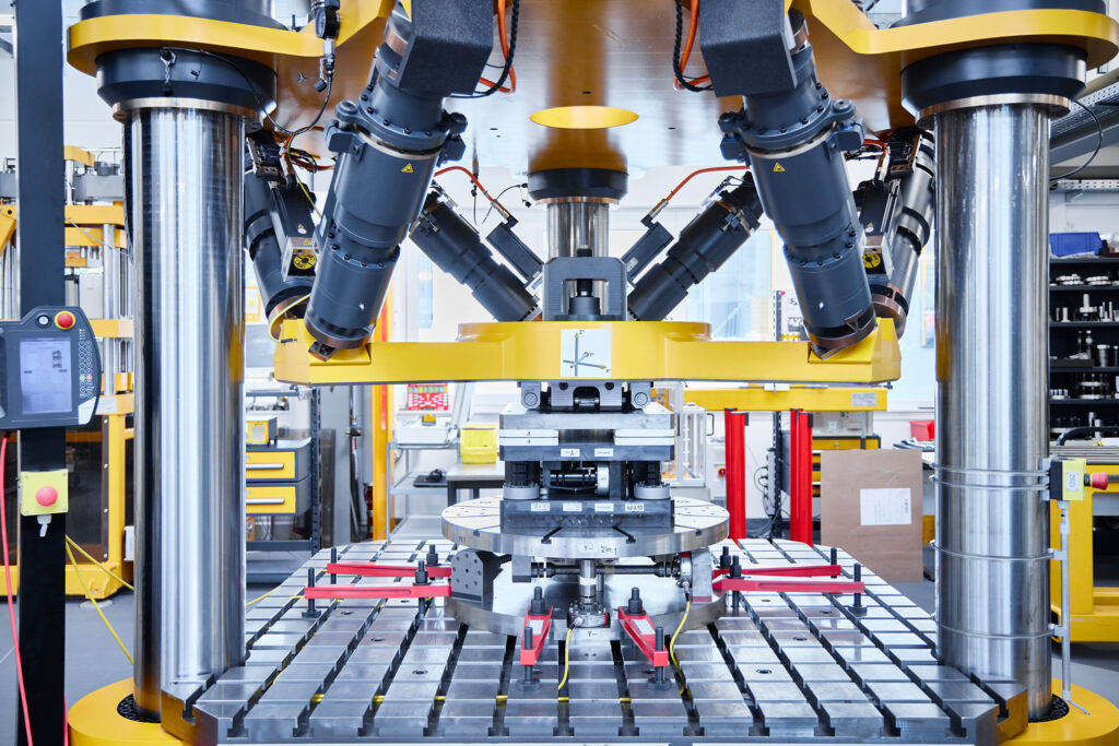 Die neu entwickelte MKA-Messeinrichtung punktet nicht nur durch den Messbereich, den Aufbau und die schiere Größe – vor allem das Automatisierungskonzept stellt ein Novum dar. Die neue Bezugsnormal-Messeinrichtung ermöglicht die genaue Steuerung und Regelung der Krafteinleitung über selbstentwickelte Hexapoden, während die hochpräzise und ebenfalls eigenentwickelte Aufnehmer-Messtechnik sämtliche Kräfte und Momente in Echtzeit und mit bislang unerreichter Genauigkeit erfasst und auswertet.