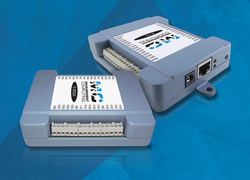 Das E-1608 von Measurement Computing ist ein 16Bit-Multifunktions-Messmodul mit acht analogen Eingängen, einer Summenabtastrate von 250kS/s sowie zwei analogen Ausgängen. Das Messmodul E-TC bietet den Direktanschluss von acht beliebigen Thermoelementen und ermöglicht mit einer Auflösung von 24Bit präzise Temperaturmessungen. Mit 24 konfigurierbaren digitalen I/Os ist das Modul E-DIO24 für Steuerungs- und Regelungsaufgaben geeignet. Neben der kompakten Serie, die sich in LAN-Infrastrukturen einbinden lässt, bedient das Unternehmen über Ethernet auch Multikanalanwendungen zur Erfassung von Spannung oder Temperatur. Die Messgeräte sind kompatibel zu Windows, Linux oder Android und unterstützen Messtechnikapplikationen wie DAQami, Labview oder DasyLab. Auch eine Programmierung unter Visual Studio oder Python ist mit den mitgelieferten Bibliotheken und Beispielen möglich.