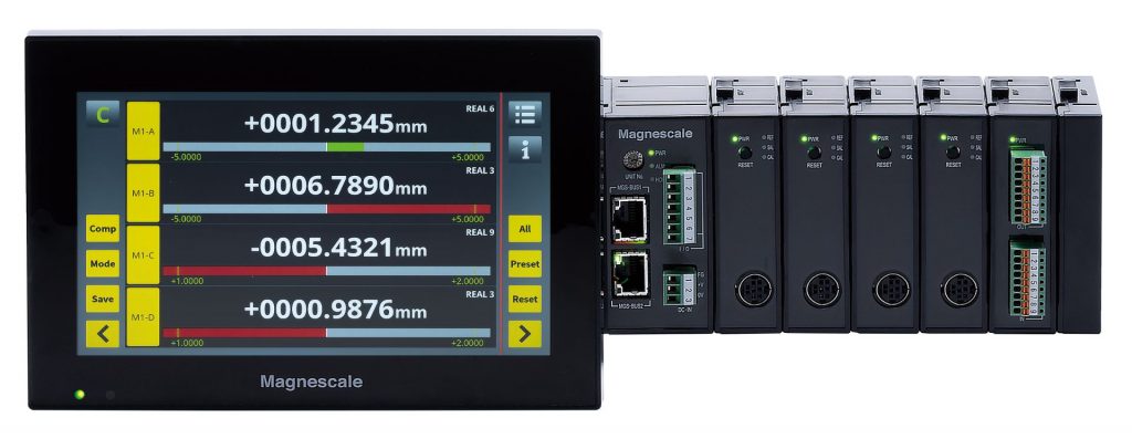 Das LT80 Multifunktionsdisplay von Magnescale mit den dazugehörigen Interface-Modulen der MG80-Serie wurde für in Serienproduktionen eingesetzte Messtaster entwickelt, um Messdaten schnell zu erfassen und auszuwerten. An diesem Interfacesystem können gleichzeitig bis zu 32 inkrementelle Messtaster angeschlossen und ausgelesen werden. Die benötigte Zeit zur internen Verarbeitung der Messdaten soll dabei bei höchstens 50µs liegen. Über die Interface-Module können bis zu 32 I/Os zur Anlagensteuerung genutzt werden. Weiterhin kann über einen separaten Trigger-Eingang die Messwerterfassung mit einem Zeittakt von bis zu 100µs synchron für alle Kanäle ausgelöst werden. Somit eignet sich dieses Interfacesystem insbesondere für Anwendungen, welche eine schnelle und synchrone Verarbeitung und Auswertung von großen Messdatenmengen erfordern.