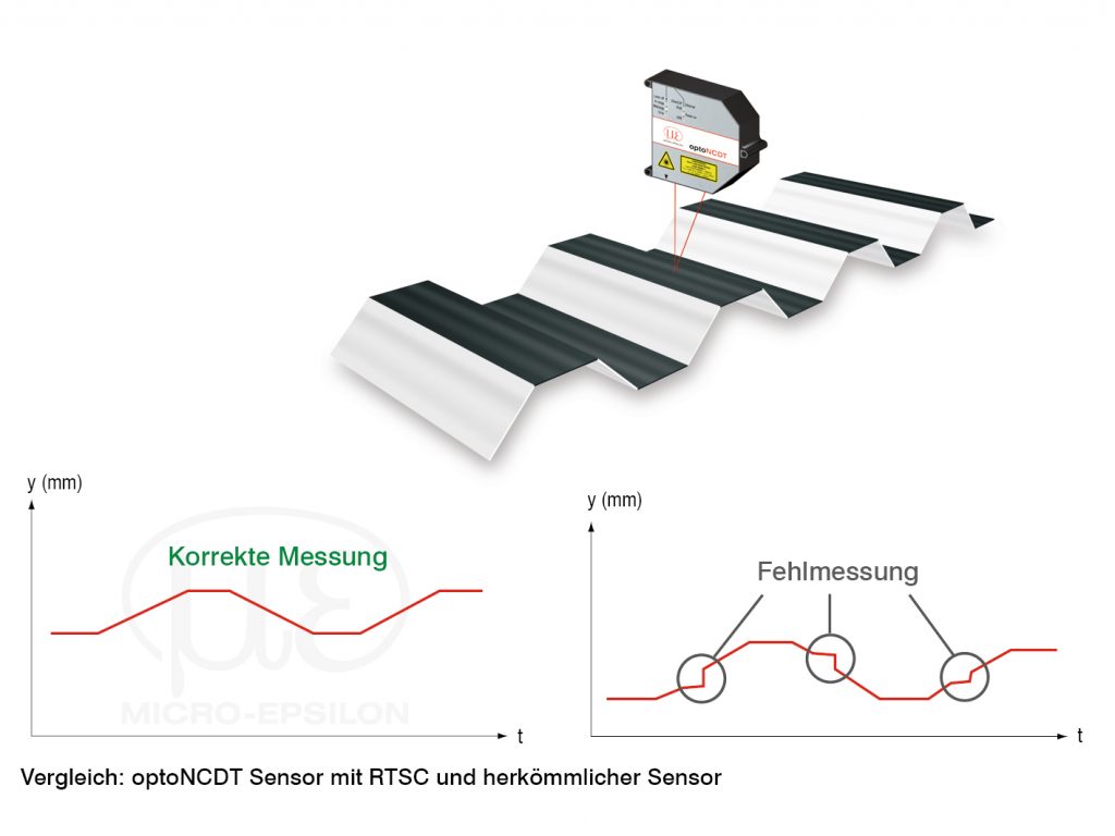 Durch die vorhandenen Presets kann der Anwender den Sensor für verschiedenste Oberflächen optimieren. Im Menü kann er zwischen drei Presets auswählen. Das erste wird als Standard-Preset für alle Materialien verwendet, bei denen der Laserpunkt nicht eindringt, z. B. für Stahl oder Kunststoffe. Das nächste Preset eignet sich für Material, in das der Strahl eindringt. Verwendet wird es für Keramik oder für helle strahlendurchlässige Kunststoffe und Papier. Das dritte Preset passt zu wechselnden Oberflächen wie z.B. Leiterplatten. Dort dringt der Strahl in das FR4 (Leiterplattenmaterial) ein, während er von glänzenden Leiterbahnen stark reflektiert wird. Das laseroptische Messsystem arbeitet dank der Realtime Surface Compensation (kurz: RTSC) Oberflächenkompensation nahezu material- und farbunabhängig. Das RTSC-System wurde vor mehr als 15 Jahren entwickelt. Das System greift bei schnell wechselnden Oberflächeneigenschaften. Ein typisches Beispiel ist ein Barcode, der für einen klassischen optischen Lasersensor ein schwieriges Messobjekt darstellt, da sich die Menge des zurückgestrahlten Lichts permanent ändert. Den häufigen Wechsel zwischen hell und dunkel gibt es auch auf anderen Oberflächen bzw. Bauteilen, bei denen die Dicke oder der Abstand geprüft werden müssen. Gängige Sensoren lösen diese Messaufgabe über den Microcontroller, der allerdings mehr Zeit benötigt, da er eine ganze Programmschleife durchlaufen muss, um dann wieder am Startpunkt zu beginnen. Der Vorgang dauert meist vier bis fünf Takte bis der erfasste Belichtungswert wieder in die nächste Belichtung einfließt. Der Sensor muss im ersten Takt belichten, im zweiten die Zeile auslesen, im dritten Takt bewertet er das Messsignal und im vierten gibt er das Ergebnis an die Schnittstelle weiter. Bis zu dem Punkt, an dem er bewertet, erkennt der Sensor nicht, ob die Belichtung richtig war. Wenn er bei der Auswertung erkennt, dass zu viel Licht die Messung gestört hat, muss er rechnen und regelt in der nächsten Schleife den Wert zurück. Die Folge ist oft eine Neuregelung durch den Sensor. Beim RTSC dagegen ist die Belichtungsregelung direkt in die Zeile integriert. Dort wird das Licht über einen analogen Schaltkreis während der eigentlichen Belichtung kontrolliert. Der Füllstand des Pixels wird gemessen und während der aktuellen Belichtung des Bildes registriert der analoge Schaltkreis, ob genügend Licht vorhanden ist, und der Laser abgeschaltet werden muss. Die Messung erfolgt, sobald belichtet wird.