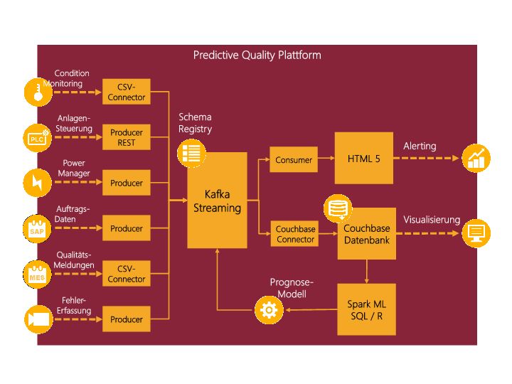 Um eine industriell einsetzbare Plattform darzustellen, muss diese Verarbeitungskette verschiedenen Kriterien genügen. Neben einem modularen Aufbau und den Verzicht auf proprietäre Software ist eine hohe Skalierbarkeit für die echtzeitnahe Verarbeitung großer Datenmengen erforderlich. Weiterhin müssen, nicht nur für das Beispiel einer vorausschauenden Qualitätssicherung, Werkzeuge für die Erstellung valider Prognosemodelle verfügbar sein. Als technologische Plattform bietet sich das Apache Hadoop Eco-System an, das als freie Software-Lizenz verfügbar ist. Aus diesem Eco-System sind für den genannten Anwendungsfall nur einige Komponenten erforderlich. Als wesentliche Komponente ist das Kafka-Streaming zu nennen, ein Baustein, mit dem sich große Datenmengen in Echtzeit akquirieren und an die eigentlichen funktionalen Anwendungen weitergeben lassen. Die Daten aus den verschiedenen – in der industriellen Praxis recht heterogenen – Quellen zu bereinigen und zu harmonisieren übernehmen dabei sogenannte Producer. Die Datenweitergabe erfolgt durch Bausteine, die sich Consumer nennen. Eine Schema Registry enthält dabei stets den aktuellen semantischen Bezug zwischen den Daten. Durch diese modulare Architektur lässt sich die Plattform leicht an die Erfordernisse verschiedener Fertigungsprozesse anpassen. Das Erstellen valider Prognose-Modelle erfordert teilweise lange Betrachtungszeiträume des Produktionsgeschehens. Um Daten dafür vorzuhalten bietet sich die Couchbase-DB an, eine NOtonlySQL-Datenbank, die insbesondere bei den in der Produktion häufig vorkommenden langen Prozesswertreihen deutliche Performance-Vorteile bietet. Mit Spark Machine Learning, der Statistik-Sprache R und fallweise mit Hilfe von SQL-Programmierung, werden aus dieser Datenbank die Prognose-Modelle erstellt und bei Bedarf den aktuellen Produktionsprozessen angepasst. Diese Modelle finden nun ihre Anwendung in dem Echtzeitdatenstrom, sodass bei Qualitätsabweichungen Fertigungseingriffe sofort ausgelöst oder Mitarbeiter benachrichtigt werden können.