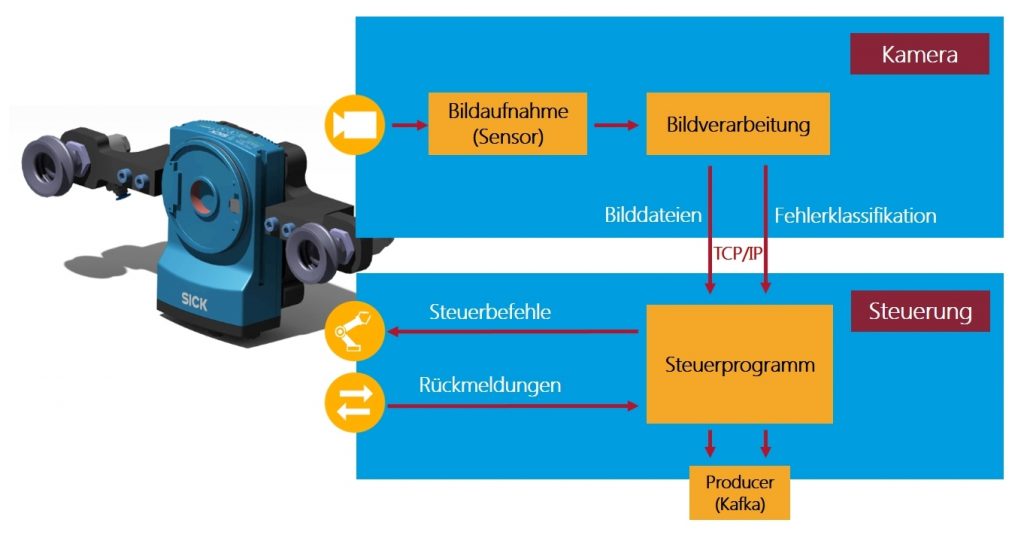 Für ein wirksames Prognose-Modell ist also das initiale – und später auch immer wieder korrektive – ´Lernen´ der Zusammenhänge zwischen Prozess- und Betriebsdaten und den gefertigten IO/NIO-Teilen mit Fehlerklassifikation erforderlich. Dabei kann eine gleichmäßig verteilte Stichprobe aus dem Produktionsprozess ausreichen, sodass nicht im Produktionstakt geprüft werden muss. Eine solches ‚Lernen‘ wird durch eine Roboterprüfzelle mit Bildverarbeitung realisiert, die in den bestehenden Materialfluss integriert werden kann. Der Roboter übernimmt dabei die Aufgabe des Materialhandlings/-transports sowie die Positionierung der Kamera für die zu prüfenden Bauteile, um mehrere Aufnahmen des Bauteils zu ermöglichen. Hierbei unterscheiden sich die einzelnen Aufnahmen durch den Winkel zwischen Kamera und Prüfteil, wodurch die Klassifizierung unterschiedliche Fehlerarten möglich ist. Die Bildverarbeitung findet in der intelligenten Kamera statt und beinhaltet neben der Identifikation eines Oberflächenfehlers – in Verbindung mit den Koordinaten des Roboters – die genaue Lokalisierung des Fehlers auf dem Bauteil. Nach der Überprüfung des Bauteils wird dieses vom Roboter aufgenommen und zurück in den Materialfluss gebracht. Die Steuerung des Ablaufs erfolgt durch einen Industrie-PC. Dieser überträgt auch die Prüfergebnisse, zusammen mit gegebenenfalls gefundenen Fehlermarkierungen, an die Prädiktions-Plattform. Dort erfolgt die Zuordnung der Informationen zu den übrigen Daten des Bauteils. Auf Basis dieser Daten wird das Modell für die Qualitätsprognose also laufend verbessert.