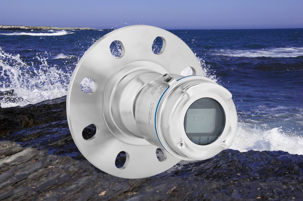 Mit dem berührungslosen Sensor NivoRadar NR 3000 von UWT wurde ein passender Lösungsansatz für die Applikation gefunden. Radarsensoren werden neben den elektromechanischen Loten häufig zur kontinuierlichen Füllstandmessung in Lagerprozessen eingesetzt. Sie messen Distanzen bis zu 100m und können durch ihre hohe Sensibilität nicht nur in sehr feinen Schüttgütern sondern auch in unterschiedlichen Flüssigkeiten und Pasten eingesetzt werden. Der Radarsensor arbeitet mit einem frequenzmodulierten 78GHz Signal, welches mit einer sehr engen Strahlkeule von nur 4° ausgesendet, vom Meerwasser reflektiert und wieder vom Sensor empfangen wird. Die Frequenzdifferenz, welche direkt proportional zum Abstand ist, wird dann weiter verarbeitet und als Füllstandsignal ausgegeben.