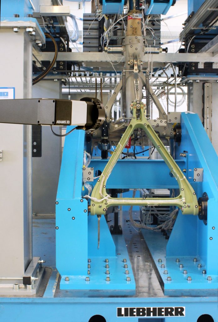 Bevor Fahrwerkssysteme für den Flugbetrieb freigegeben werden, sind intensive Testkampagnen notwendig, um ihre Tauglichkeit hinsichtlich der hohen Anforderungen an Funktion, Sicherheit und Lebensdauer unter Beweis zu stellen. Dafür setzt die Luft- und Raumfahrtindustrie verstärkt optische Messsysteme zur Erfassung von Oberflächen sowie 3D-Verschiebungen und -Verformungen ein. Hierdurch werden Bauteilverformungen bei statischen oder dynamischen Belastungstests sowohl punktuell als auch flächenhaft ermittelt. Mit diesen Messdaten werden Simulations- und Konstruktionsprozesse kontinuierlich optimiert, sodass die Strukturbauteile steigenden Anforderungen bei gleichzeitiger Einhaltung der hohen Sicherheitsvorgaben gerecht werden. Liebherr-Aerospace führt in seinem Testzentrum in Lindenberg mit der Aramis 3D Camera Strukturtests auf Subsystemebene an neu entwickelten Fahrwerkssystemen durch. Bei diesen zulassungsrelevanten Strukturtests werden prinzipiell zwei Kategorien unterschieden: Limit- bzw. Ultimate-Strength-Tests und Ermüdungstests. Während das Fahrwerkssystem bei den Limit- und Ultimate-Strength-Tests seine strukturelle Integrität unter quasistatischen Belastungen unter Beweis stellen muss, werden bei den Lebensdauertests zyklische Betriebslasten aufgebracht, um die Zeitfestigkeit der Fahrwerke gegenüber der Spezifikation zu verifizieren. Die äußeren Lasten werden dafür durch Hydraulikzylinder über repräsentative Belastungsvorrichtungen in die Fahrwerksstruktur eingeleitet, um Verschiebungen am gesamten Fahrwerk in den verschiedenen Belastungszuständen zu analysieren.