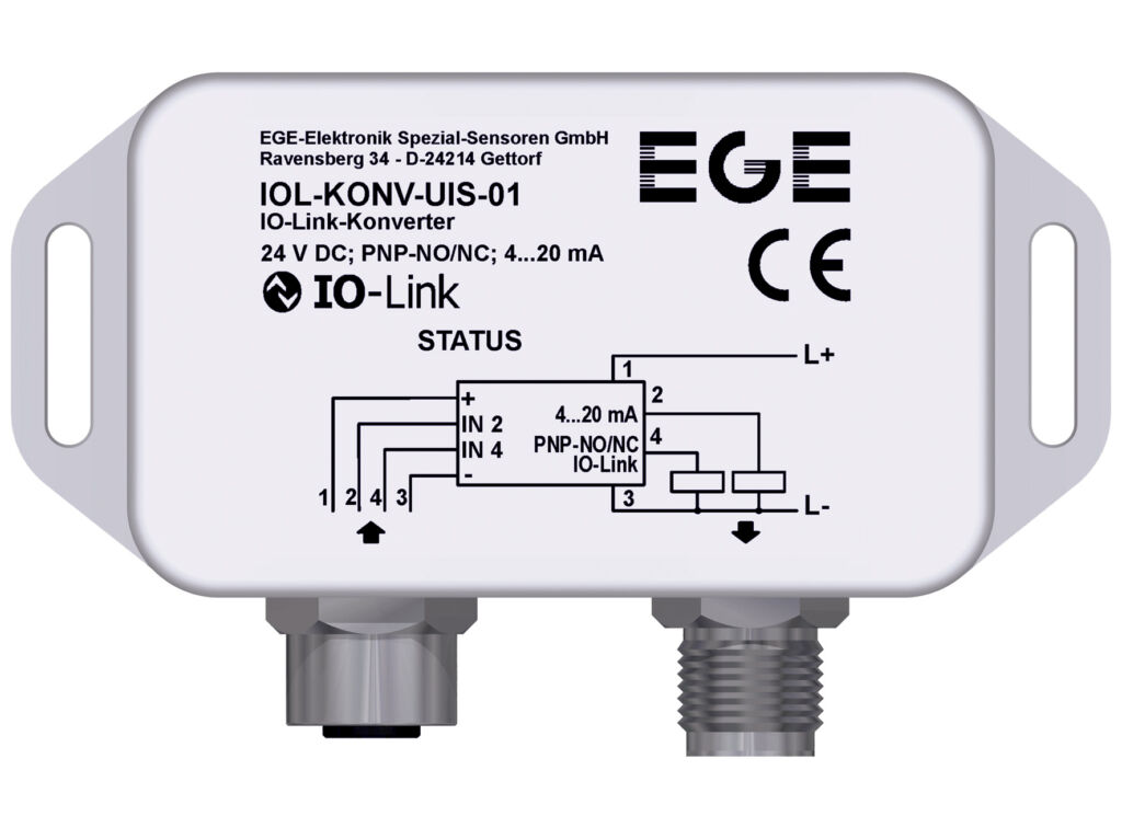 An den IO-Link-Konverter lassen sich alle herkömmlichen Sensoren von EGE oder anderen Herstellern unabhängig von Funktionsprinzip und Messzweck anschließen. Die großzügig dimensionierten Befestigungslaschen des nur 41mm langen und 71mm breiten, in Schutzart IP67 ausgeführten Konvertergehäuses ermöglichen auch unter erschwerten Einbaubedingungen eine flexible Montage in Sensornähe. Dabei erübrigt der Anschluss an Sensoren und IO-Link-Master über Standardkabel und ungeschirmte M12-Steckverbinder jeglichen Verkabelungsaufwand. Eine gut erkennbare Mehrfarb-LED im Gehäusedeckel zeigt den Betriebszustand an. Die Parametrierung des Konverters gemäß IO-Link-Device-Description V1.1 erfolgt mittels eines Engineering-Tools über die IO-Link-Schnittstelle.