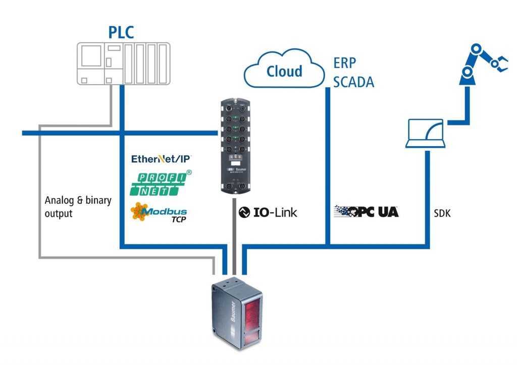 Smarte Sensoren, wie z.B. der Profilsensor OX200, verfügen über zahlreiche Kommunikationsschnittstellen, um anhand der gewonnen Daten die TCO und OEE von Anlagen und Maschinen weiter zu verbessern. – Bild: Baumer Electric AG