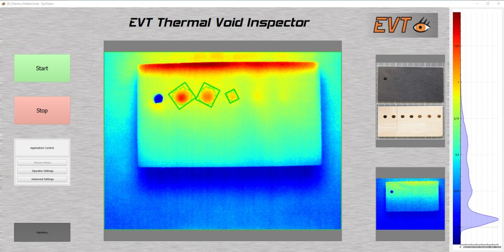 Der HVI (Hole & Void Inspector) basiert auf der EyeVision-Software und aktiver Thermografie. Es lässt sich schnell an unterschiedliche Anwendungen anpassen. Die Hardware besteht aus einem Rechner und einer Thermografiekamera, z.B. von Optris oder Flir. Bei der aktiven Thermografie wird ein Objekt aktiv mit Wärme bestrahlt z.B. mit einem Hochleistungsblitz. Danach wird beobachtet wie sich das Material abkühlt. Durch die unterschiedliche Wärmeableitung vom Material und dem eingeschlossenen Hohlraum lässt sich dieser erkennen. Das Verfahren funktioniert auch bei Produktionsprozessen die exotherm stattfinden wie z.B. beim Aufschäumen von Kunststoffen. Wobei es hier nicht notwendig ist den Kunststoff zu erwärmen. Es genügt den Kunststoff sofort nach der Produktion mit der Wärmebildkamera aufzunehmen. Es wird eine Bildfolge aufgenommen und anhand dieser geprüft wie die Abkühlung erfolgt. Lücken kühlen mit einer anderer Geschwindigkeit als das Material und können dadurch identifiziert werden. Die Integration des Inspektionssystems in eine Maschine erfolgt direkt über die verfügbaren Schnittstellen. Dies sind zwei GigE-Kameraanschlüsse, über die bis zu vier Thermokameras angeschlossen und gesteuert werden können. Zwei weitere Schnittstellen stehen zur Verfügung, z.B. für einen Feldbus, wie Profinet, OPC UA oder Modbus sowie eine weitere Schnittstelle zur Integration in ein Scada-System. Damit kann die Maschine den thermischen Auswerteprozess steuern und je nach Ergebnis, fehlerhafte Produkte ausschleusen. Gleichzeitig ist es auch möglich die Prüfergebnisse mit den Thermografiebildern an das Qualitätswesen weiterzuleiten. Das HVI kann zudem mit einem Display betrieben werden. Dadurch kann vor Ort geprüft werden, wo sich der Fehler befindet. Alternativ lässt sich das HVI auch Headless betreiben, das heißt das System sendet nur die Prüfergebnisse und auf Anforderung die Auswertebilder, an einen Leitrechner oder über den integrierten Webserver an einen Browser. Die Auswertemöglichkeiten des Systems sind vielfältig und können an die Anforderungen der jeweiligen Aufgabe angepasst werden. Die Erstellung eines solchen Prüfablaufes erfolgt über eine Drag&Drop-Funktion. Die Ergebnisse können entweder an eine SPS kommuniziert werden, oder über die acht Ein- und acht Ausgänge, oder direkt Aktoren bzw. Leuchtsignale angesteuert sowie der Prüfablauf ausgelöst werden.