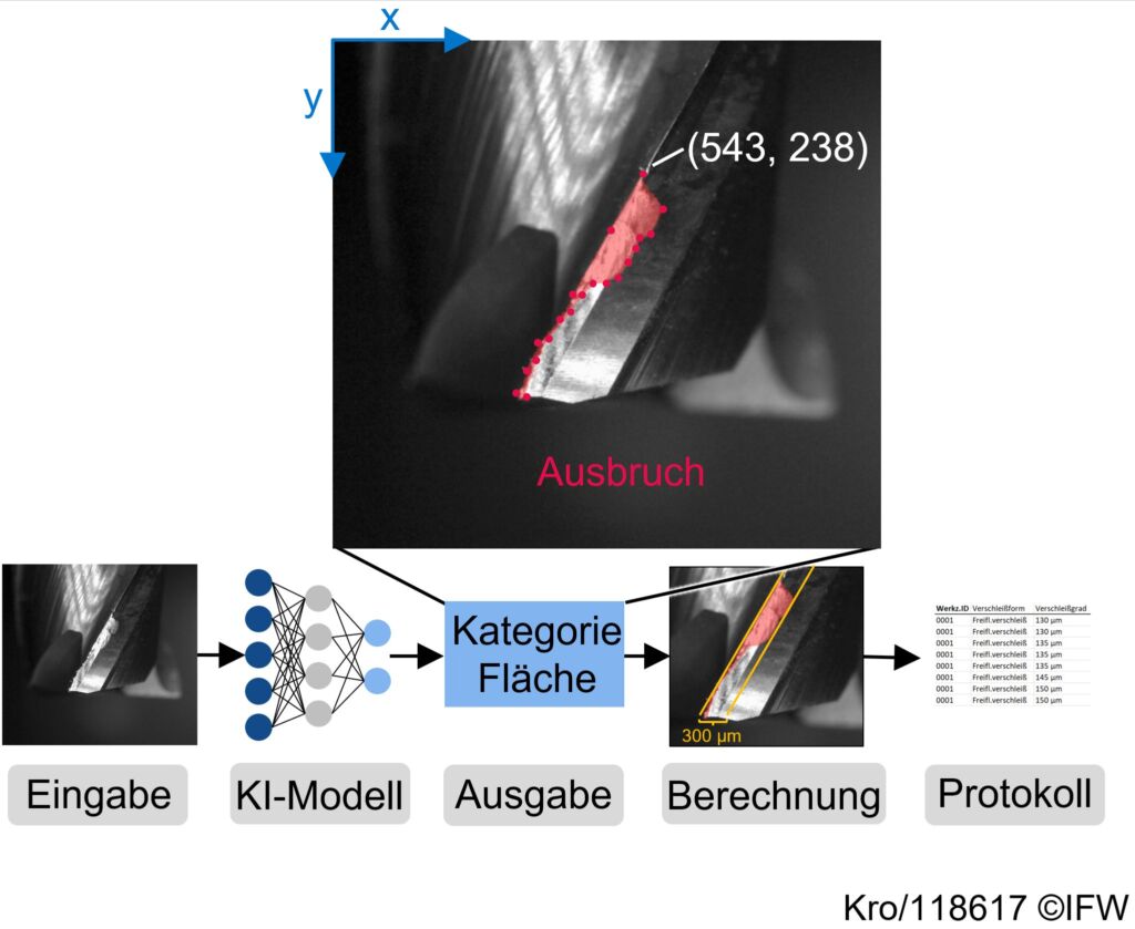 Mit dem entwickelten System wurde bereits ein erster Datensatz aufgenommen, der Bilddaten von Werkzeugen mit variierendem Verschleißzustand enthält. Das nachfolgende Bild zeigt ein Beispiel aus dem Datensatz (Eingabe). Des Weiteren wird ein Ausblick auf die weiteren geplanten Schritte gezeigt. Das Live-Bild (Eingabe) soll im nächsten Schritt auf die Grey.Box übertragen werden. Außerdem übertragen wird einmalig ein vorab trainiertes KI-Modell. Für das Training wird der Datensatz um weitere Verschleißformen erweitert und die Bilddaten gelabelt. Das trainierte Modell erkennt und quantifiziert dann die verschlissene Fläche sowie zukünftig die Verschleißform (Kategorie). Auf Grundlage der segmentierten Fläche kann dann der Verschleißgrad berechnet und ein Protokoll der Verschleißform und der Verschleißentwicklung erstellt werden. Aus diesem Protokoll können dann Handlungsempfehlungen abgeleitet werden.