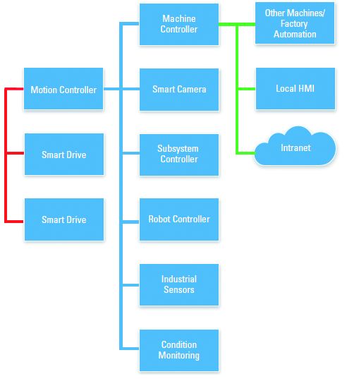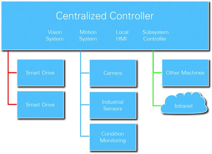 Verteilte Systeme sind üblicherweise, wie in Bild 2 dargestellt, als ein Netzwerk intelligenter Subsysteme angelegt, die zusammen ein verteiltes, ineinandergreifendes System ergeben. Erhöht sich die Systemleistung, kann dieser hardwarezentrierte Ansatz jedoch zu Problemen führen, da die Subsysteme häufig sowohl über zeitkritische als auch nicht zeitkritische Protokolle miteinander kommunizieren. Dadurch ergeben sich zwangsläufig Engpässe bei Latenz, Determinismus und Durchsatz. So kann es z.B. bei Anwendungen, die ein nahtloses Zusammenspiel von Bildverarbeitung und Motion Control erfordern – wie z.B. bei der bildgestützten Robotersteuerung (Visual Servoing) – mit einer verteilten Architektur zu erheblichen Leistungsproblemen kommen, die sich jedoch erst aufgrund der gestiegenen Verarbeitungskapazität offenbaren. Hinzu kommt, dass jedes Subsystem über einen eigenen Controller gesteuert wird, wodurch es zu einer geringeren Verarbeitungseffizienz kommt, da keines der einzelnen Subsysteme die tatsächliche Verarbeitungsleistung des Gesamtsystems benötigt. Entwickler sind daher mit diesem verteilten, hardwarezentrierten Ansatz gezwungen, für jedes Subsystem andere Designwerkzeuge zu verwenden, was insbesondere kleinere Entwicklerteams oder Einzelingenieure vor Herausforderungen stellt.
