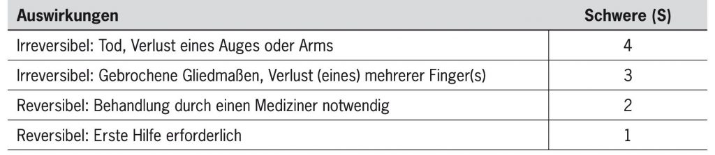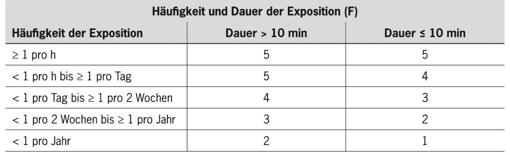 Die Vierstufigkeit mit den beispielhaften Beschreibungen macht eine Bewertung einfacher. Wobei es immer noch schwer zu beurteilen ist, ob z.B. erste Hilfe ausreicht oder ein Arzt herbeigeholt werden muss. Im zweiten Schritt wird dann die Häufigkeit und Dauer der Exposition (F) beurteilt: