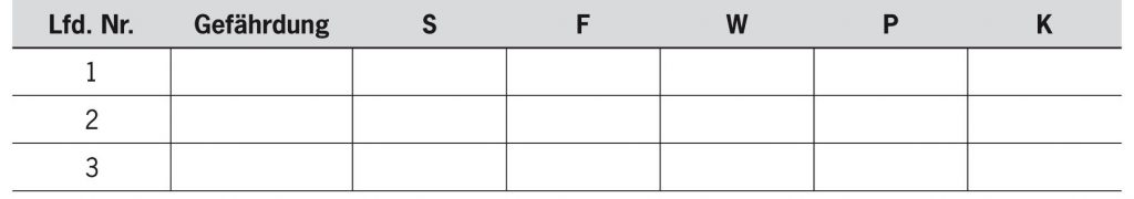Auch hier sieht man wieder die Grenzen einer solchen Beurteilung. Es werden keine Hilfestellungen gegeben. Nachdem alle Beurteilungen vorgenommen wurde, werden die einzelnen Punkte in eine Tabelle zusammenführt, wobei für jede einzelne Gefährdungsstelle eine Zeile ausgefüllt werden muss.