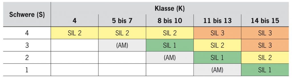 Pro Gefahrenstelle werden in der Zeile die zuvor ermittelten Werte S, F, W und P eingetragen. Die Spalte K ergibt sich aus der Addition von F+W+P. Mit den beiden Werten S und K kann anschließend aus der folgenden Tabelle ein SIL ermittelt werden.