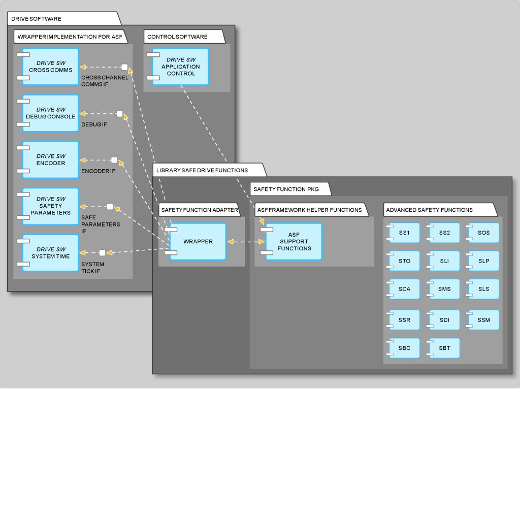 Interessant ist, dass die Software-technische Umsetzung dieser Antriebssicherheitsfunktionen generisch erfolgt und in Form einer Software-Bibliothek leicht wiederverwendet werden kann. Solch eine Bibliothek kann vom Antriebshersteller während seiner Entwicklungsphase integriert werden, um wertvolle Entwicklungsressourcen einzusparen. Den symbolischen Zusammenhang zwischen der Bibliothek, hier im Beispiel die von Mesco vorentwickelte Bibliothek ‚Sichere Antriebsfunktionen‘, und der überlagerten Gerätefirmware zeigt Bild 2. Die Bibliothek ist für einen zweikanaligen Betrieb ausgelegt und besitzt zwei unterschiedliche Arten von Schnittstellen. Zum einen benötigt sie Informationen, welche durch Callback-Funktionen, gekapselt in der Wrapperklasse, von der Gerätefirmware abgeholt werden. Typische Beispiele sind die Encoder- und Zeitinformation oder die Funktionsschnittstelle zum Anfordern bzw. zur Freigabe der gewünschten Sicherheitsfunktion, die von der Gerätefirmware aufgerufen wird. Die Bibliothek enthält derzeit die Sicherheitsfunktionen SS1, SS2, SOS, SLI, SLP, SCA, SMS, SLS, SSR, SDI, SSM und SBC/SBT. Der Antriebshersteller kann auf einer einheitlichen Hardware-Plattform beliebige Kombinationen der Sicherheitsfunktionen implementieren. Dies kann z.B. für individuelle Preismodelle, je nach freigeschaltetem Funktionsumfang, genutzt werden.