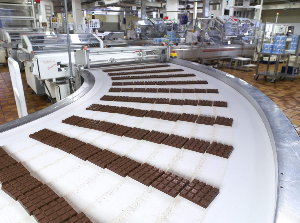 Ritter Sport Alpenmilchschokolade kurz vor dem Verpacken – Bild: Euchner GmbH + Co. KG