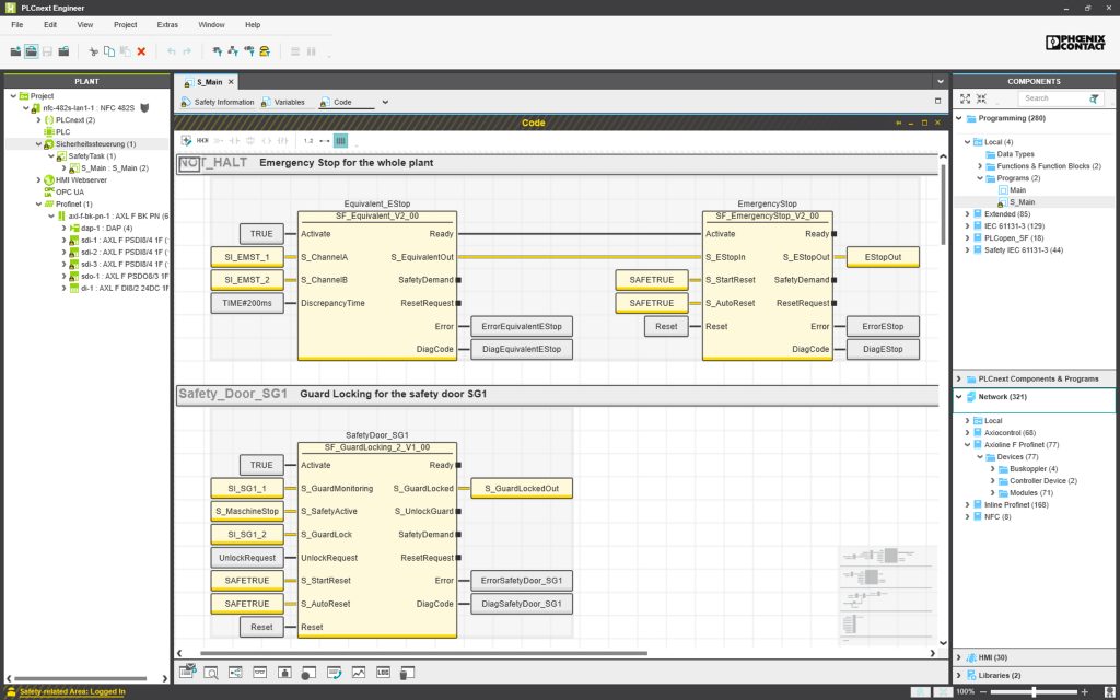 Zur Erstellung der C-Funktionen lässt sich die gewohnte und schon im Entwicklungsprozess eingesetzte Umgebung nutzen. Die Entwickler brauchen sich also nicht in ein neues Tool einzuarbeiten. Der kompilierte Code muss im standardisierten ELF-Format (Executable and Linking Format) vorliegen. Diese plattformunabhängige Lösung wird von vielen bekannten Programmiersprachen supportet. Durch die Verwendung von Standard-Entwicklungssystemen und -Programmiersprachen sowie standardisierten Dateiformaten können während der Entwicklung ebenfalls Standard-Tools zur Unterstützung eingesetzt werden, die z.B. nicht für IEC61131-3-basierte Programme verfügbar sind. Darunter fallen unter anderem Software-Werkzeuge zur Messung der Code-Abdeckung (Code Coverage), Software zur Feststellung der Testabdeckung oder lediglich einfache Anbindungen an Versionsmanagementsysteme wie GIT oder Subversion. Aus der Nutzung von Standard-Entwicklungssystemen resultiert darüber hinaus der Vorteil, dass sich das Programm mit einfachen Mitteln überprüfen lässt. Die zu generierenden Funktionen müssen allerdings gemäß den einschlägigen Normen – wie der IEC61508 – in der Full Variability Language (FVL) entwickelt werden. Dazu bietet sich häufig die Beauftragung eines geeigneten Dienstleisters an, der die Aufgabenstellung im Rahmen eines passenden Entwicklungsprozesses realisiert. Der erarbeitete Code muss anschließend in der richtigen Form mit der sicherheitsbezogenen Anwenderapplikation an die Steuerung gesendet werden können. Die Engineering-Software PLCnext Engineer des offenen Ecosystems PLCnext Technology stellt zu diesem Zweck ein zusätzliches Add-in bereit, das es dem Ersteller der sicherheitsgerichteten Funktionen erlaubt, eine abgeschlossene Bibliothek zu erzeugen. Dies geschieht innerhalb von PLCnext Engineer mit wenigen Mausklicks.