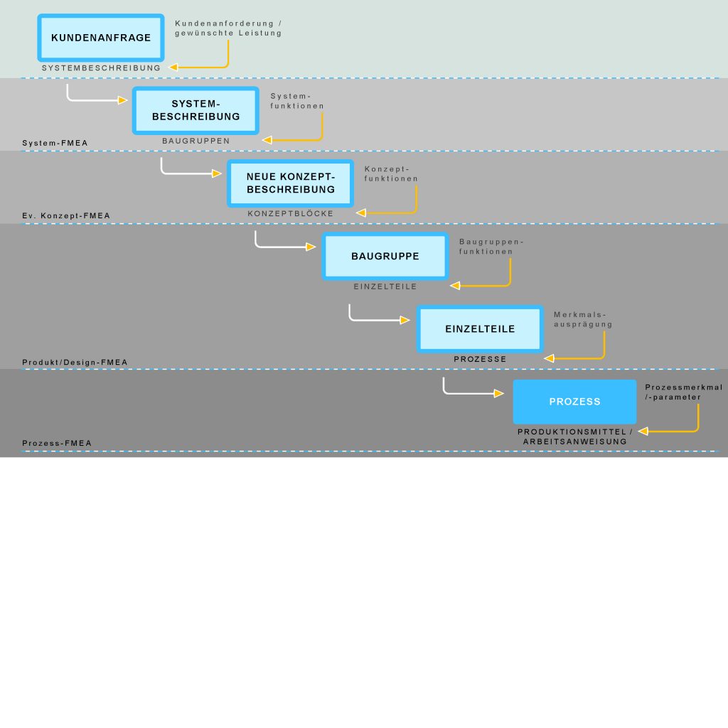 - Die FMEA bauen aufeinander auf und Punkte aus der jeweils vorgelagerten FMEA, die nicht aufgelöst werden können oder Verweise auf die nachfolgenden FMEAs beinhalten, müssen in die neuen FMEAs aufgenommen werden.