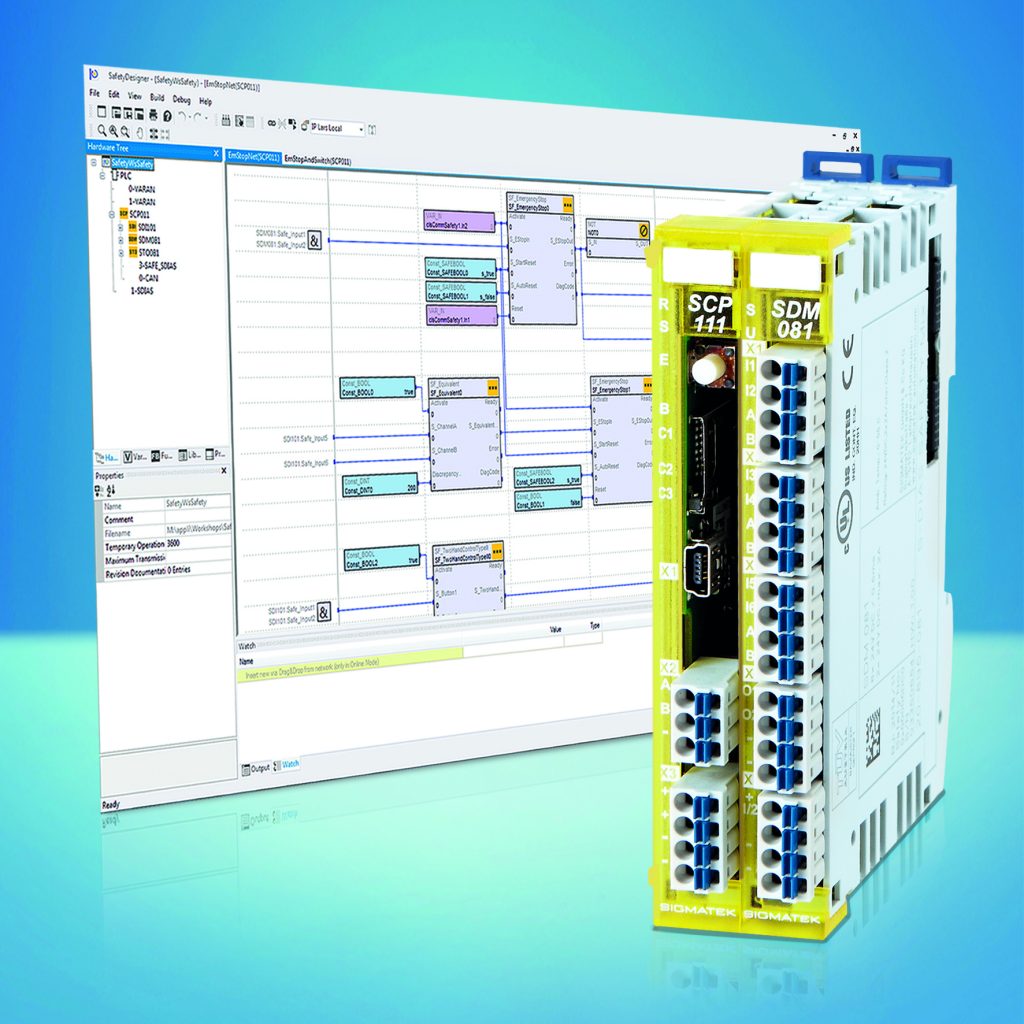 Sigmatek bietet mit dem modularen System S-Dias Safety eine wirtschaftliche Lösung, mit der sich Sicherheitsfunktionen flexibel und skalierbar realisieren lassen. Das Herzstück des Systems bildet der Safety-Controller SCP 111. In Kombination mit dem digitalen Mixmodul SDM 081 mit sechs digitalen Ein- und zwei digitalen Ausgängen steht ein freiprogrammierbares Mini-Safety-System mit 25mm Schaltschrankbreite bereit. Damit lassen sich Funktionen wie Not-Halt, Türkontakt, Lichtgitter oder Betriebsarten-Wahlschalter sicher umsetzen. Für komplexere Sicherheitsanwendung stehen weitere I/O-Module zur Verfügung: das SDI 101 mit zehn digitalen Eingängen, das STO 081 mit acht kurzschlussfesten, digitalen Ausgängen, das Relais-Modul SRO 021 mit zwei Relais-Ausgängen sowie das SSI 021 zur Auswertung von zwei SSI-Absolutwertgeber-Signalen.