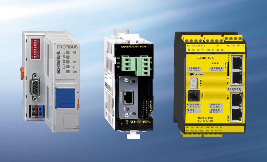 Sicherheitslösung für komplexe Anlagen: Der SD-Bus von Schmersal ermöglicht die Übermittlung von umfangreichen Status- und Diagnosedaten von bis zu 31 unterschiedlichen Sicherheitssensoren, -zuhaltungen und Bedienfeldern. – Bild: Schmersal Gruppe