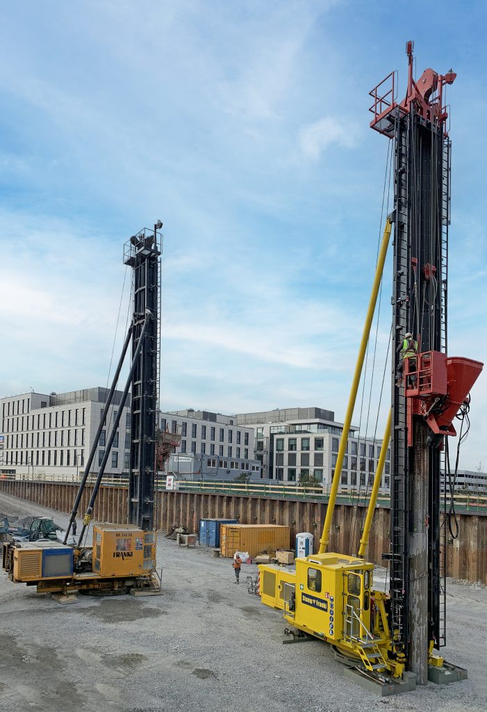 Die Franki-Ramme verfügt über vier Seilwinden, die oben verbaut sind – inklusive dreier Drehgeber zur Positionsüberwachung. Im vorderen Bereich befindet sich der sogenannte Mäkler, ein Gestell, an dem das Rammrohr oder Vortreibrohr aus Stahl angebracht ist, das oben und unten offen ist. In das Rammrohr wird ein Pfropfen aus Beton und Kies eingefüllt, und mit dem Rammbären, einem massiven Stahlklotz, wird der Pfropfen mit sehr kleinen Schlägen verdichtet. Beim Rammbären handelt es sich um ein Freifallsystem. Wenn der Pfropfen durch die Schläge im Rohr fest verkeilt ist, wird die Fallhöhe erhöht und das Rammrohr bis zur Endtiefe im tragfähigen Baugrund gebracht. Dann wird der Pfropfen mit dem Rammbär ausgestampft. Es bildet sich der sogenannte Franki-Fuß aus, der wie ein Dübel wirkt. Nach der Fußherstellung wird der Bewehrungskorb eingestellt und plastischer Beton nachgefüllt, sodass ein durchgehender Pfahl entsteht. Nach der Erhärtung des Betons und dem Kappen des Pfahlkopfes ist der Pfahl bereit zur Lastenaufnahme.