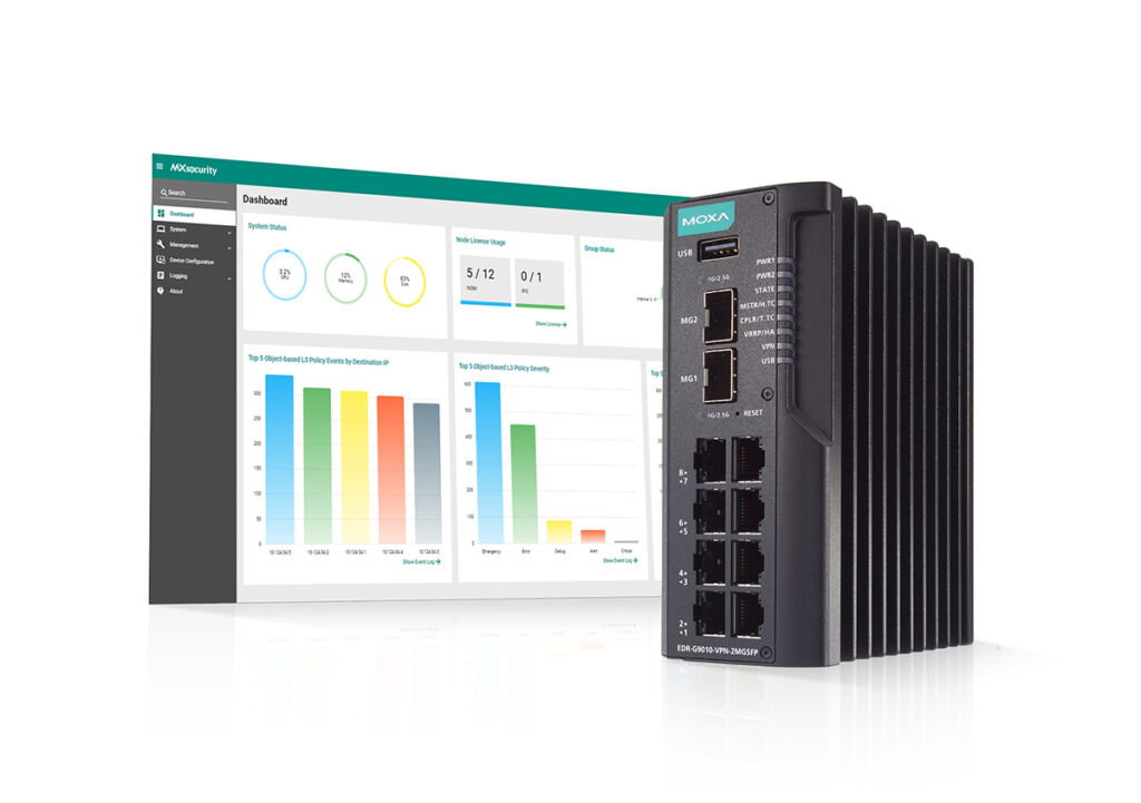 Moxa führt neben seiner Managament-Software für industrielle Sicherheit MXsecurity industrielle Intrusion-Detection/-Prevention-Systeme (IDS/IPS) ein. Die Serie EDR-G9010 stellt einen sicheren All-in-One-Router mit Firewall-/NAT-/VPN-/Switch-Funktion dar. Durch den Zusatz von IDS/IPS wird die Serie EDR-G9010 zu einer industriellen Firewall, ausgestattet mit Bedrohungserkennungs- und verhinderungsfunktionen, um kritische Infrastrukturen noch wirksamer vor Angriffen auf die IT-Sicherheit zu schützen. Zudem ist MXsecurity eine speziell zugeschnittene Sicherheitsmanagement-Suite, die Echtzeit-Einsicht in Cyberbedrohungen bietet und es den Benutzern ermöglicht, sichere Router der Serie EDR-G9010 vor Ort zentral zu verwalten. Die Lösungen sind auf Zuverlässigkeit und durchgehende Konnektivität ausgelegt, um dauerhafte Hochleistungs-Industrienetzwerke zu schaffen. Mit Unterstützung für virtuelles Patching hilft die Serie EDRG9010 außerdem, alte Systeme vor Schwachstellen zu schützen, was Fertigungsplanern mehr Zeit und Flexibilität für industrielle Abläufe gibt.