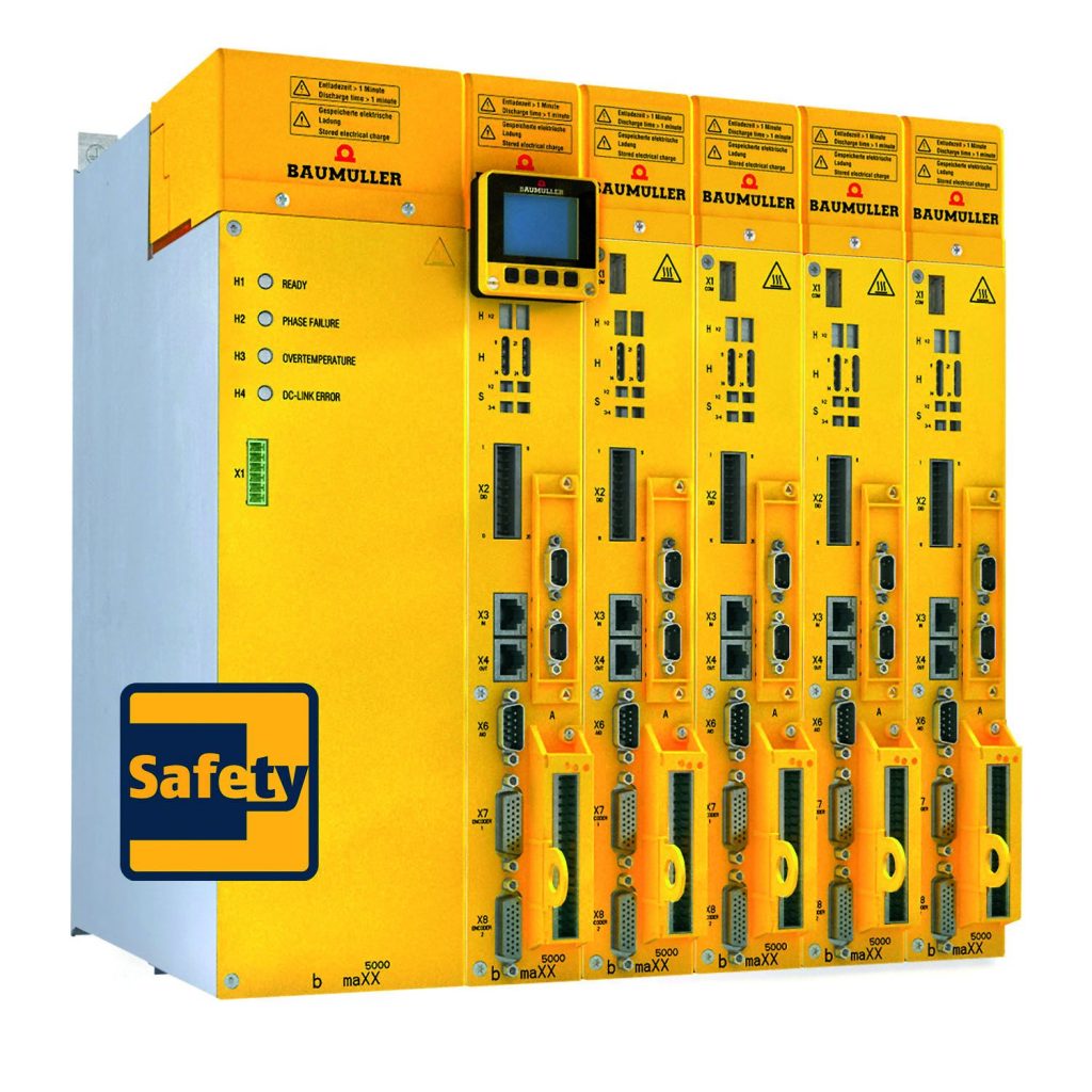 Für die anreihbare Umrichtergeneration B Maxx 5000 bietet der Antriebs- und Automatisierungsspezialist Baumüller ab sofort eine neue Sicherheitslösung, bei der die Abschaltung der Elektromotoren nicht dezentral bei den einzelnen Motorumrichtern, sondern zentral mit einem in die Einspeiseeinheit integrierten STO-Modul (Safe Torque Off) passiert. Standardmäßig ist die Sicherheitsfunktion bei Antriebssystemen dezentral in den einzelnen Motorstromumrichtern integriert. Werden die Elektromotoren mit nur einer zentral geschalteten STO-Steuereinheit ausgestattet, verringert sich der Montage- und Verdrahtungsaufwand des Antriebssystems, was zu geringeren Herstellkosten führt. Das neue Safety-Konzept erfüllt die Sicherheitsanforderungen SIL 2 gemäß IEC61508 bzw. PLd, Kategorie 3 gemäß DIN EN ISO13849-1 und kann bei allen Anwendungen eingesetzt werden, bei denen die Einspeiseeinheit und die Achseinheiten die gleichen STO-Bedingungen erfordern.