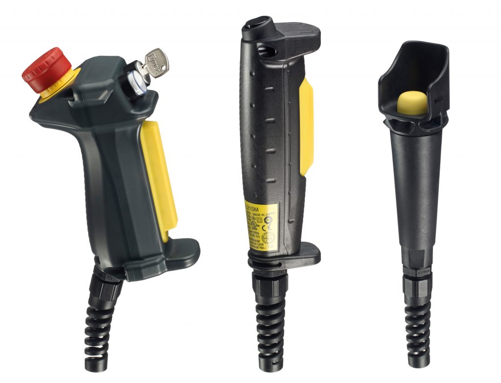 Der neue und vielseitig ausrüstbare Handgriff HE2G von Apem mit Zustimmtaster HE2B. Um auch in Stresssituationen höchste Bediensicherheit zu gewährleisten, lassen sich nach Wunsch bis zu drei weitere Komponenten wie Not-Aus-Schalter, Drucktaster, LED-Indikatoren oder Schlüsselschalter integrieren. – Bild: Apem GmbH
