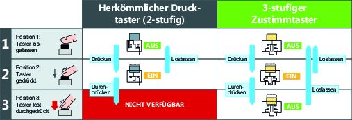 Der entscheidende Sicherheitsvorteil von 3-stufigen Zustimmtastern: Nicht nur beim Loslassen des Schalters, sondern auch sobald der Bediener – z. B. vor Schreck oder in Panik – besonders fest zudrückt, wird die Maschine abgeschaltet. – Bild: Apem GmbH