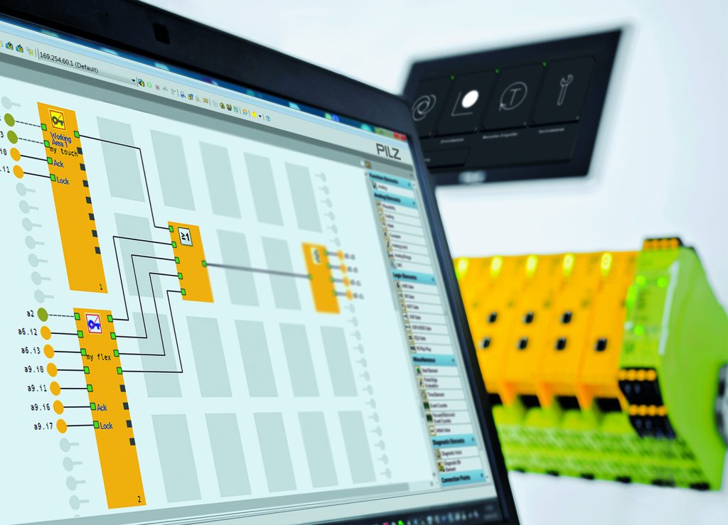 Bei der Wahl der Betriebsart und dem Management von Zugangsberechtigung übernimmt die konfigurierbare sichere Kleinsteuerung Pnozmulti 2 von Pilz nun weitere Aufgaben der Industrial Security und Safety. Sie steht ab Version 10.12 des dazugehörigen Software-Tools Pnozmulti Configurator zur Verfügung. Neu ist der Anschluss von bis zu vier Ausleseeinheiten Pitreader an das Basisgerät Pnoz m B1 der Kleinsteuerung Pnozmulti 2. So lassen sich nun auch verkettete Maschinen sicher managen. Dies stellt eine wirtschaftliche Lösung dar, da sich der Aufwand für Hardware minimieren lässt. Die Möglichkeiten dieser erweiterten Systemlösung reichen von der einfachen Freigabe über die Authentifizierung für bestimmte Maschinenteilfunktionen bis hin zu einer komplexen hierarchischen Berechtigungsmatrix. So lassen sich Zugangsberechtigungen mit hohem Manipulationsschutz konfigurieren. Mittels der Funktionsbausteine in Verbindung mit Pitreader kann an Maschinen und Anlagen die sichere Betriebsartenwahl bis PLd / SIL CL 2 konfiguriert werden. Für die sichere Betriebsartenwahl stehen neu zwei Anwendungslösungen – entweder über Taster oder über Touch-Panel – zur Auswahl. Die Berechtigung zur Anwahl einer Betriebsart erfolgt bei beiden Varianten über die Ausleseeinheit Pitreader und entsprechend konfigurierte RFID-Keys. Die Anwahl der Betriebsart mittels Taster kann über handelsübliche Drucktaster erfolgen. Einen Mehrwert für Anwender bietet das Mehrtastenelement Pit oe4S von Pilz: Es umfasst bis zu fünf Betriebsarten. Sie können über die vier auf dem Mehrtastenelement vorhandenen Einzeltaster separat angewählt werden. Müssen Anwender ihre Anlage komplett im Blick behalten, können sie alternativ auch über die Bedien- und Visualisierungsterminals Pmivisu die sichere Anwahl der Betriebsart umsetzen. Diese Variante über Touch-Panel ist vor allem bei weit verzweigten Anlagen mit mehreren, voneinander entfernten, Arbeitsbereichen von Vorteil.