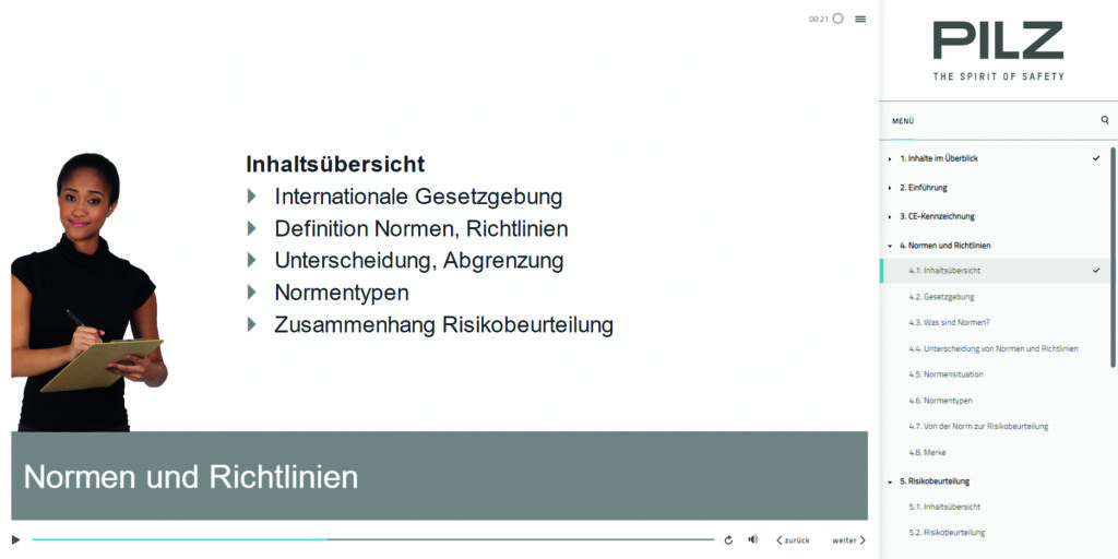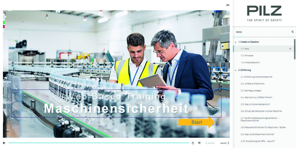 Das Web Based Training von Pilz richtet sich an Mechatroniker, Elektroniker für Automatisierungstechnik, angehende Techniker, Ausbilder, Normenverantwortliche, Konstrukteure sowie Sicherheitsbeauftragte in Betrieben. Das digitale Lernformat vermittelt Grundlagen zur Maschinensicherheit auf dem aktuellen Stand der Technik – interaktiv, nach individuellem Lerntempo und unabhängig von Ort und Uhrzeit. Vorkenntnisse sind nicht notwendig.
