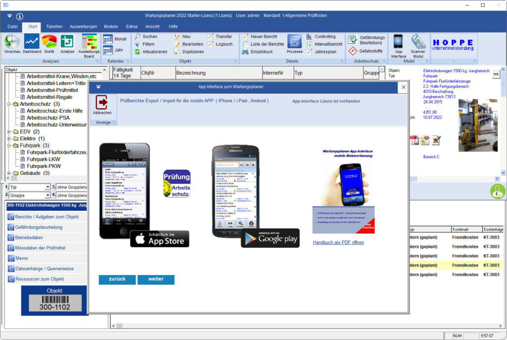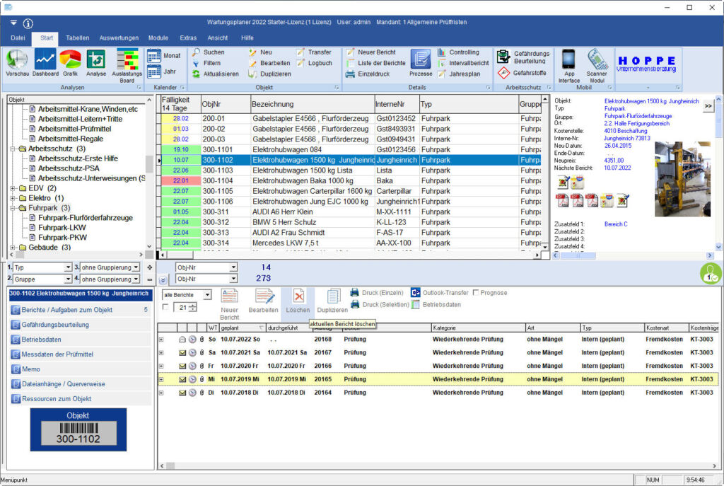Wer Baumaschinen, Baugeräte, Leitern und Tritte sowie Betriebsmittel sicher prüfen will, kommt um die Dokumentation der Prüfung nicht herum. Hierzu eignet sich eine Software, in der die Prüfberichte, Prüfergebnisse und Prüfprotokolle festgehalten werden. Mit einem passenden Dokumentationssystem können Anwender Prüfungen von Werkzeugen, Maschinen und Betriebsmitteln planen, durchführen und dokumentieren. Die Hoppe Unternehmensberatung zeigt Wege auf, wie Fehler vermieden werden können, die gravierende Folgen haben.