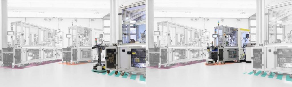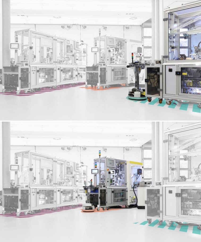 Das flexible Transportsystem (FTS) ist erstmals in das modulare Safety-Konzept der SmartFactory-KL-Industrie 4.0-Anlage mit einbezogen. Fährt das FTS in den Zonenbereich einer Produktionslinie, wird es automatisch diesem Anlagenteil und folglich auch dieser Nothaltschleife zugeordnet. Durch den Use Case wird der Vorteil des erweiterten Safety-Konzepts für modulare Produktionsanlagen in der Praxis deutlich: An Stelle des Transportsystems könnte z.B. eine Modulkomponente ebenso flexibel ausgetauscht und automatisch zertifiziert werden; es muss lediglich ein sicheres Profil für diese Komponente bereits vorliegen.