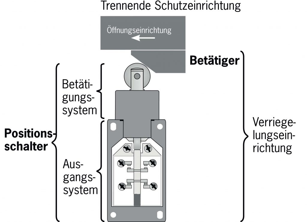 Die Norm beschreibt die Auswahl und den Einsatz von Verriegelungseinrichtungen/Verriegelungen mit und ohne Zuhaltung an Schutztüren, Schutzabdeckungen und anderen beweglichen trennenden Schutzeinrichtungen. Mit Verriegelungseinrichtungen sind Sicherheitsschalter gemeint, die an Schutztüren angebaut sind und beim Öffnen der Tür für ein sicheres Abschalten einer Maschine oder Anlage sorgen. Verriegelungseinrichtungen mit Zuhaltung (Zuhaltungen) geben den Zugang erst dann frei, wenn das Verletzungsrisiko beseitigt ist, beispielsweise bei Gefahr durch nachlaufende Maschinenbewegungen. Die Norm gibt sehr viele Hinweise speziell auch zur Auswahl einer geeigneten Verriegelungseinrichtung. Sie lässt sich in einem Ablaufdiagramm, wie unten zu sehen, sehr gut zusammenfassen. Die Norm definiert den Begriff verriegelte trennende Schutzeinrichtung. Hierzu gehören die bewegliche trennende Schutzeinrichtung und die Verriegelungseinrichtung selbst. Diese wiederum hat generell zwei Teile, den Betätiger und den Positionsschalter. Die Benennung wird unabhängig von der Bauart verwendet. Die Auswahl eines geeigneten Schutztürschalters lässt sich mit einem Ablaufdiagramm sehr gut darstellen. Innerhalb des Diagramms findet sich ein Verweis auf den jeweiligen Abschnitt in der Norm.