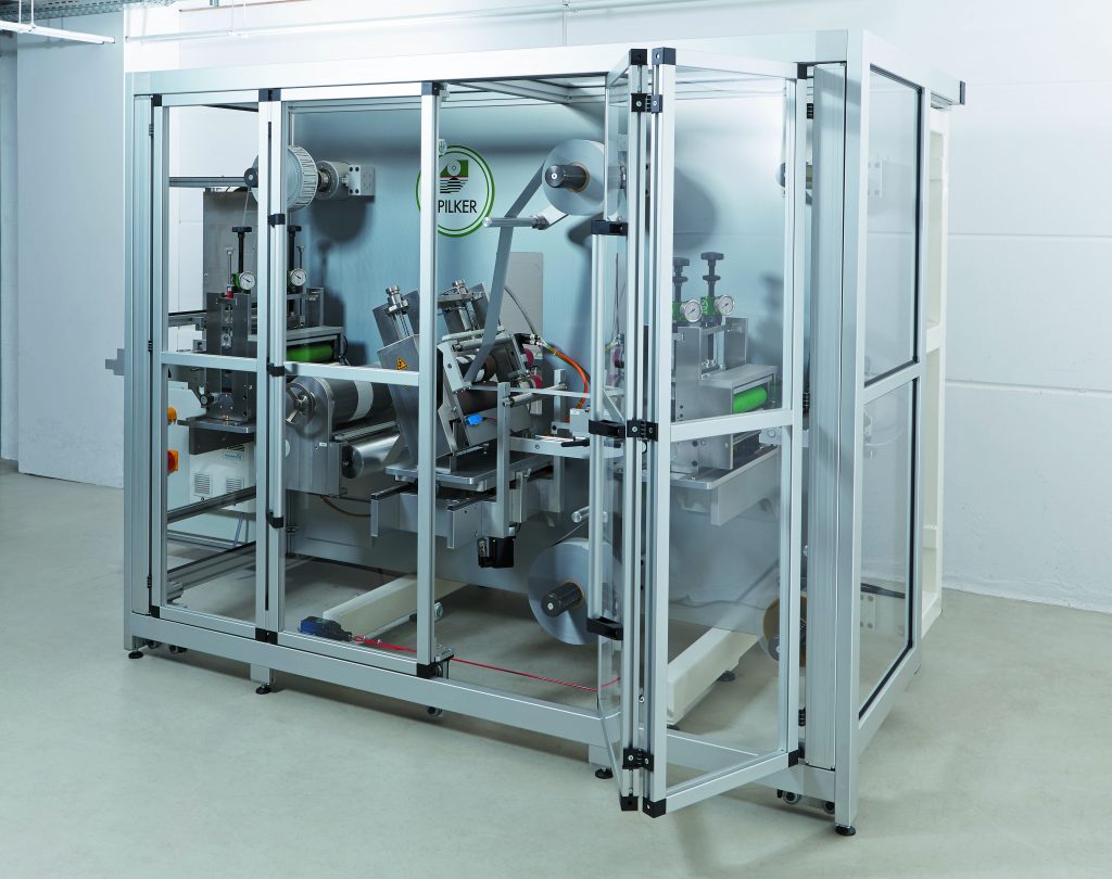 Für die Produktion von Schmerzpflastern konzipierte Spilker eine Rotationsmaschine, die unterschiedliche Spende-, Stanz- und Laminierprozesse mit dem Vorgang des rotativen Siegelns kombiniert. Dabei werden die von einer Rolle einlaufenden Pflaster zunächst vereinzelt und mit einem Einschnitt zum leichteren Öffnen der einzelnen Pflaster versehen. Anschließend erfolgt die luftdichte Verpackung der Einzelpflaster durch das Versiegeln. Ein essentieller Teil der Anlage sollte eine Schutzeinhausung werden, die die Einhaltung der zahlreichen Vorschriften garantieren würde und gleichzeitig zentrale Kundenwünsche nach einer problemlosen Zugänglichkeit über die gesamte Maschinenlänge und einem hohen Lichteinfall erfüllen musste.