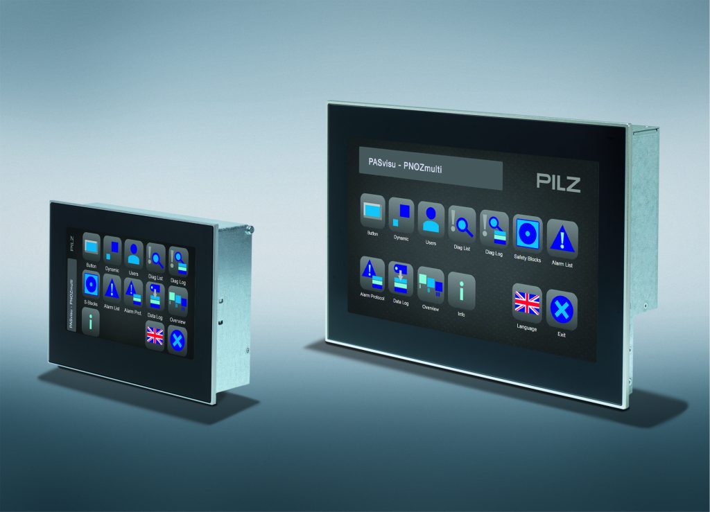 Mit den Bedien-Terminals Pmivisu v807 und v812 vervollständigt Pilz sein HMI-Portfolio um zwei robuste Varianten zur Visualisierung und Diagnose von Automatisierungsprozessen. Die kapazitiven Bedien-Terminals sind in einer 7″- sowie in einer 12,1″-Variante verfügbar und mit dem Betriebssystem Windows 10 ausgestattet. Ihre kratz- und stoßfesten Glas-Touchscreens sind sehr widerstandsfähig und verschleißarm. Damit eignen sie sich für den Einsatz in industriellen Anwendungen und trotzen selbst staubigen oder schmutzigen Umgebungen. Die webbasierte Visualisierungssoftware Pasvisu ist auf den HMIs bereits vorinstalliert und lizenziert.