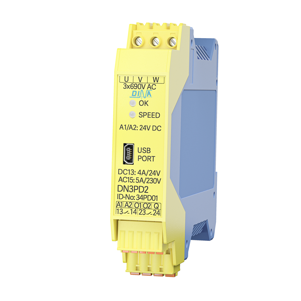 Dina Elektronik stellt das Safety-Modul Safeone DN3PD2 für die sensorlose Drehzahlüberwachung vor. Die Sicherheit bis PLe ist gegeben. Aufgrund der sensorlosen Technik können zusätzliche Geber entfallen. Durch den direkten Anschluss an die drei Phasen des Motors wird die Konfiguration vereinfacht. Die Parametrierung erfolgt über ein eigens entwickeltes Software Tool per USB-Schnittstelle. Der Frequenzbereich liegt bei 1.200Hz.