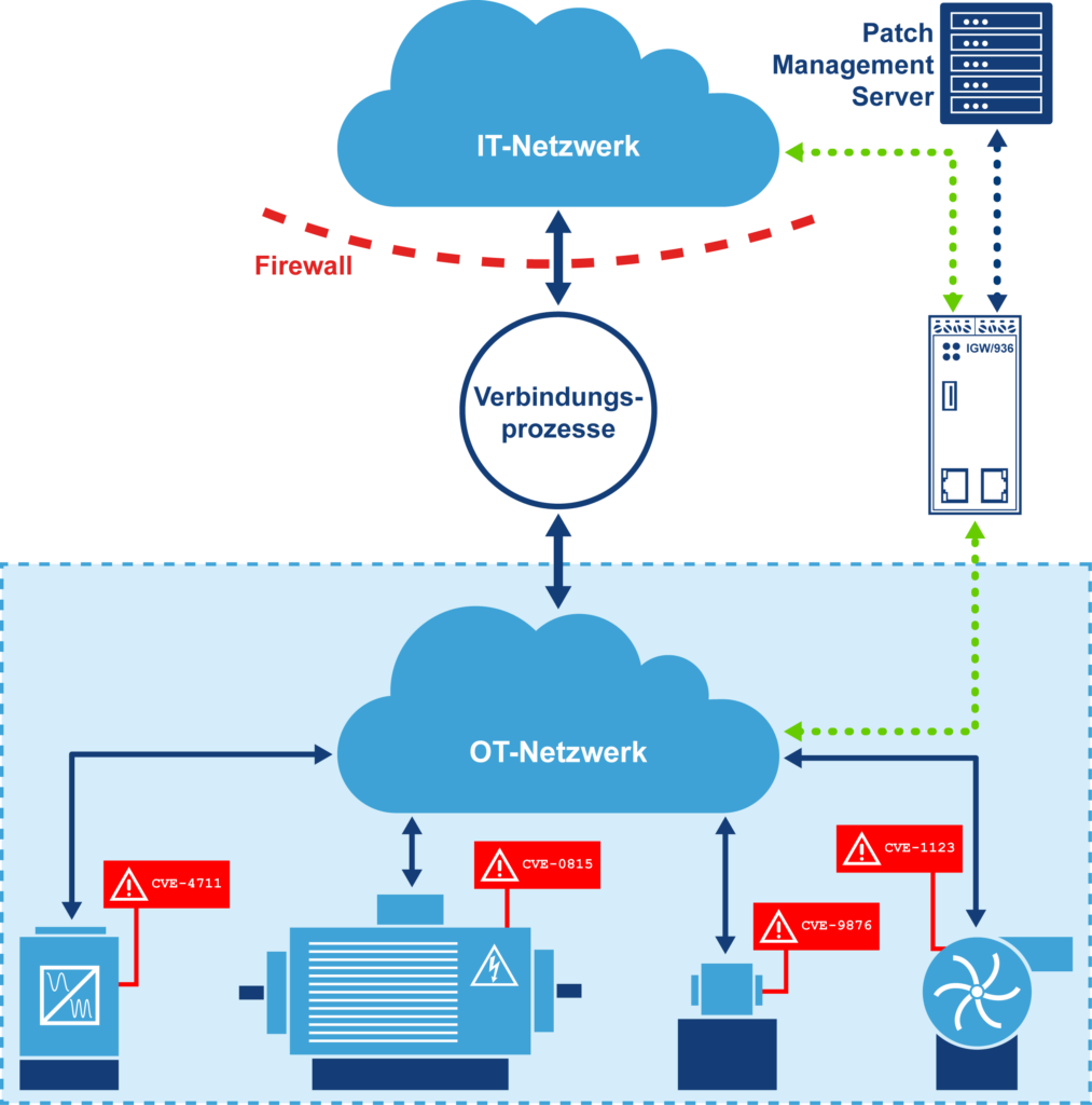 Kann der Komponentenhersteller hinsichtlich der direkten Schwachstellenbeseitigung nicht weiterhelfen oder hat sich bei der Evaluierung herausgestellt, dass sich durch den Patch das Baugruppenverhalten funktional verändern würde, ist ein virtueller Patch eine Lösung. Eine solche Patch-Methode korrigiert nicht die eigentlich fehlerhafte Anwendung bzw. Firmware der betroffenen OT-Baugruppe (der alte Baugruppenzustand und die jeweilige CVE bleiben also unverändert erhalten). Der virtuelle Patch sorgt stattdessen über eine externe Zwischen- bzw. Isolationsschicht indirekt dafür, dass sich die Sicherheitslücke nicht durch Zugriffe aus dem IT-Netzwerk heraus missbräuchlich ausnutzen lässt, beispielsweise für Cyberattacken. Mithilfe der virtuellen Patch-Technik kann in der Praxis auch ein alter Windows-PC, für den es schon lange keine Updates mehr gibt, der aber im Moment funktional unersetzbar ist, mit überschaubarem Risiko weiterbenutzt werden.