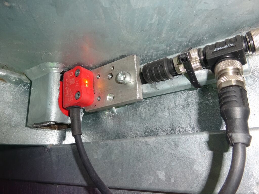 Ein weiterer Sicherheitssensor SRF kommt zur Abfrage der oberen Position der Ladebühne zum Einsatz. Eben dort befindet sich auch eine Zugangstür zur Bühne. Sobald die Hebebühne sich bewegt, muss gewährleistet sein, dass diese sich nicht mehr öffnen lässt und Personen sich außerhalb des Gefährdungsbereichs aufhalten. Diese Aufgabe übernimmt Bernsteins Verriegelungsschalter SLC. Er hält die Tür so lange geschlossen, bis sich die Ladebühne in der oberen Position befindet und diese vom SRF sicher bestätigt wird.